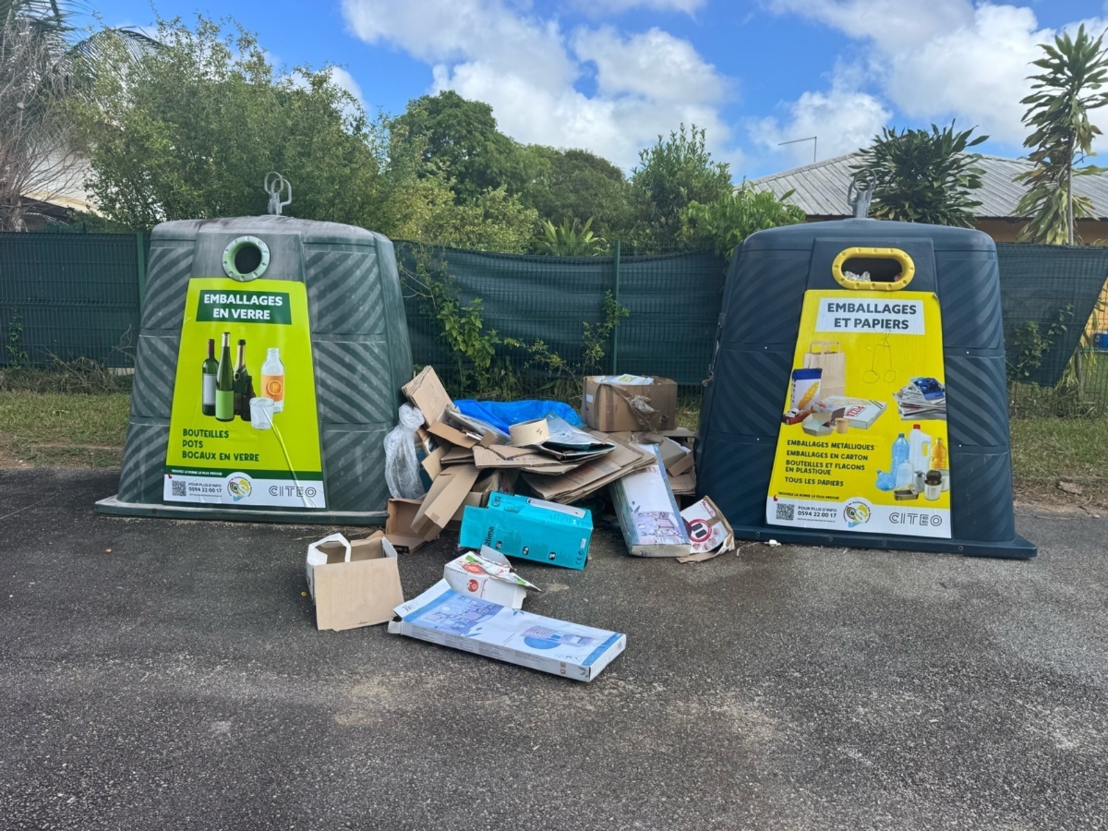 Un dépôt d'emballages cartons a été signalé à côté d'une poubelle de tri à Kourou, indiquant sa faible capacité.