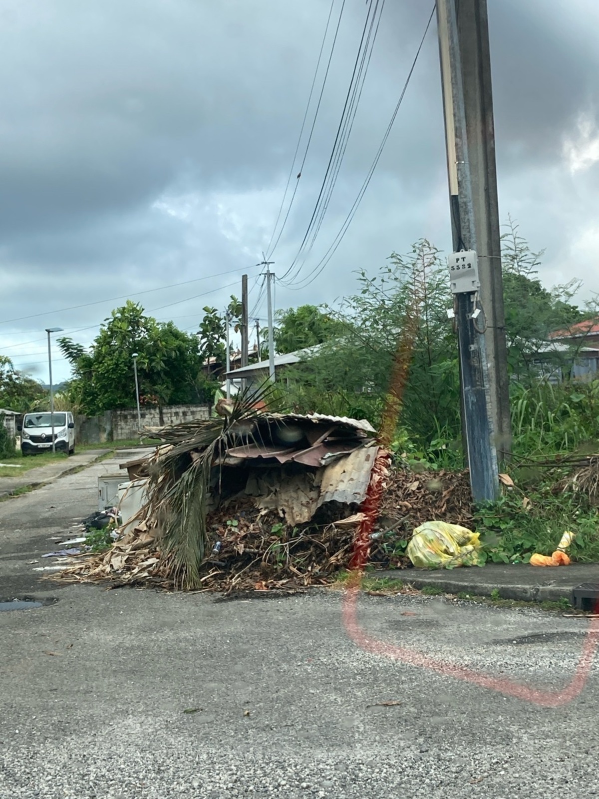 Un dépôt de déchets de moyenne ampleur constitué de déchets verts, de ferraille et de déchets ménagers a été signalé sur un bord de route au nord de la route de la Distillerie.