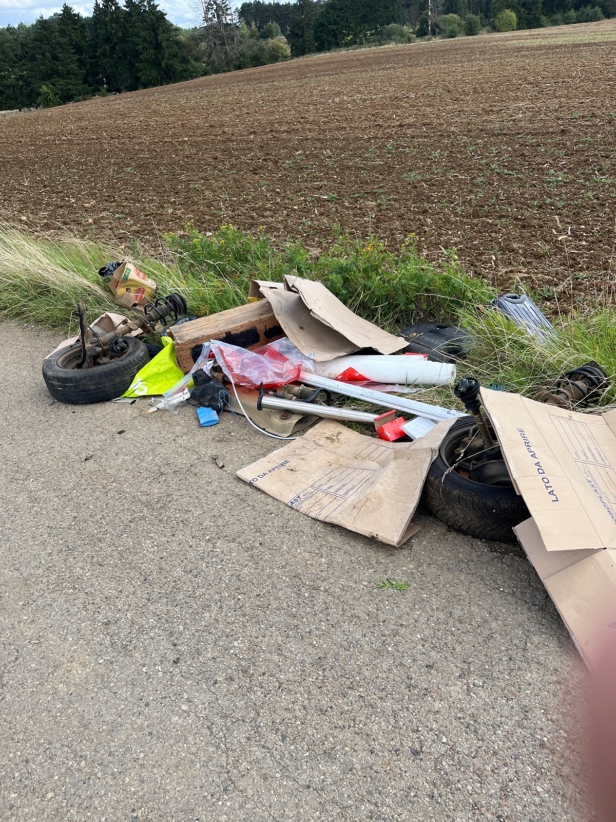 Dépôt sauvage au bord de la route composé de pneus et déchets divers (cartons, plastiques)