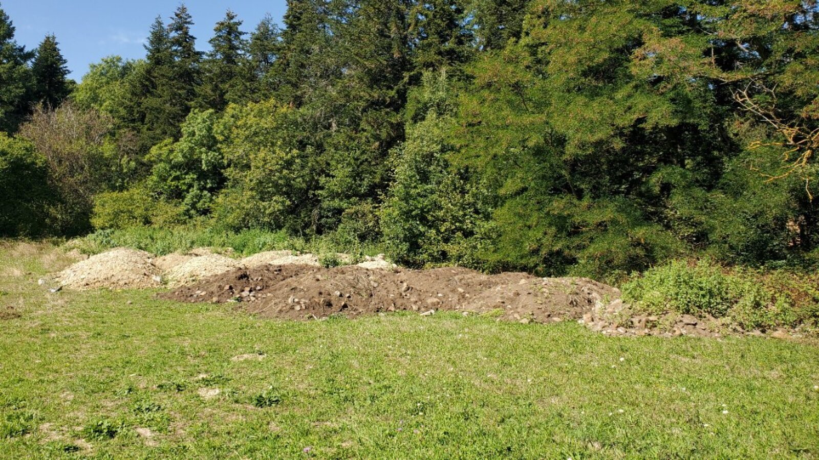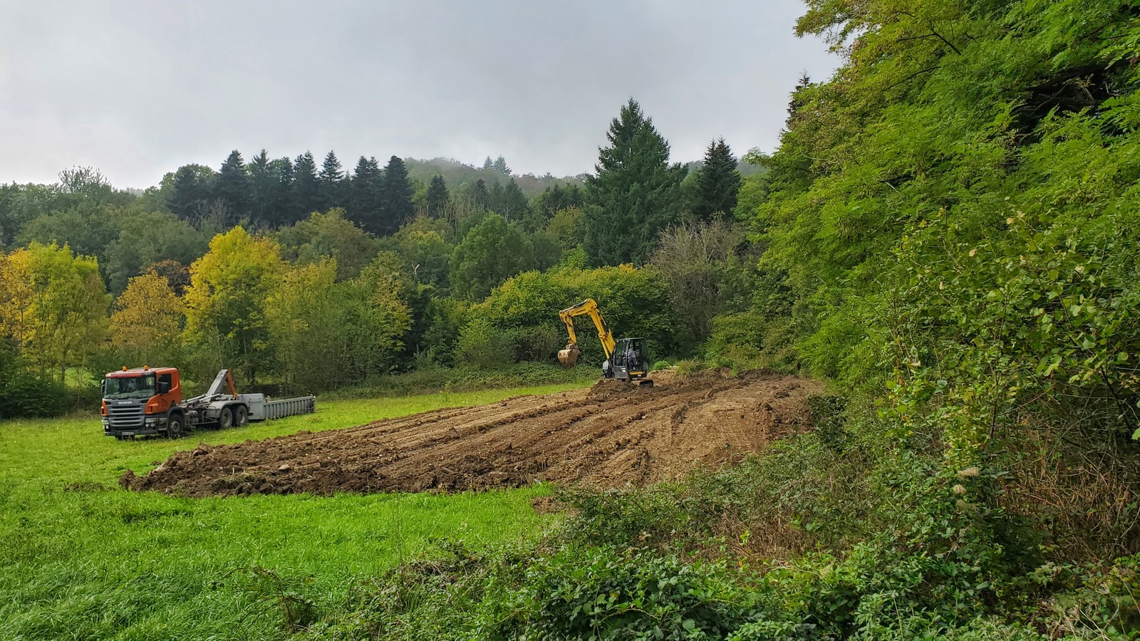 Le 11 octobre 2025 : Travail d'une pelleteuse pour recouvrir les gravats de terre végétale.
