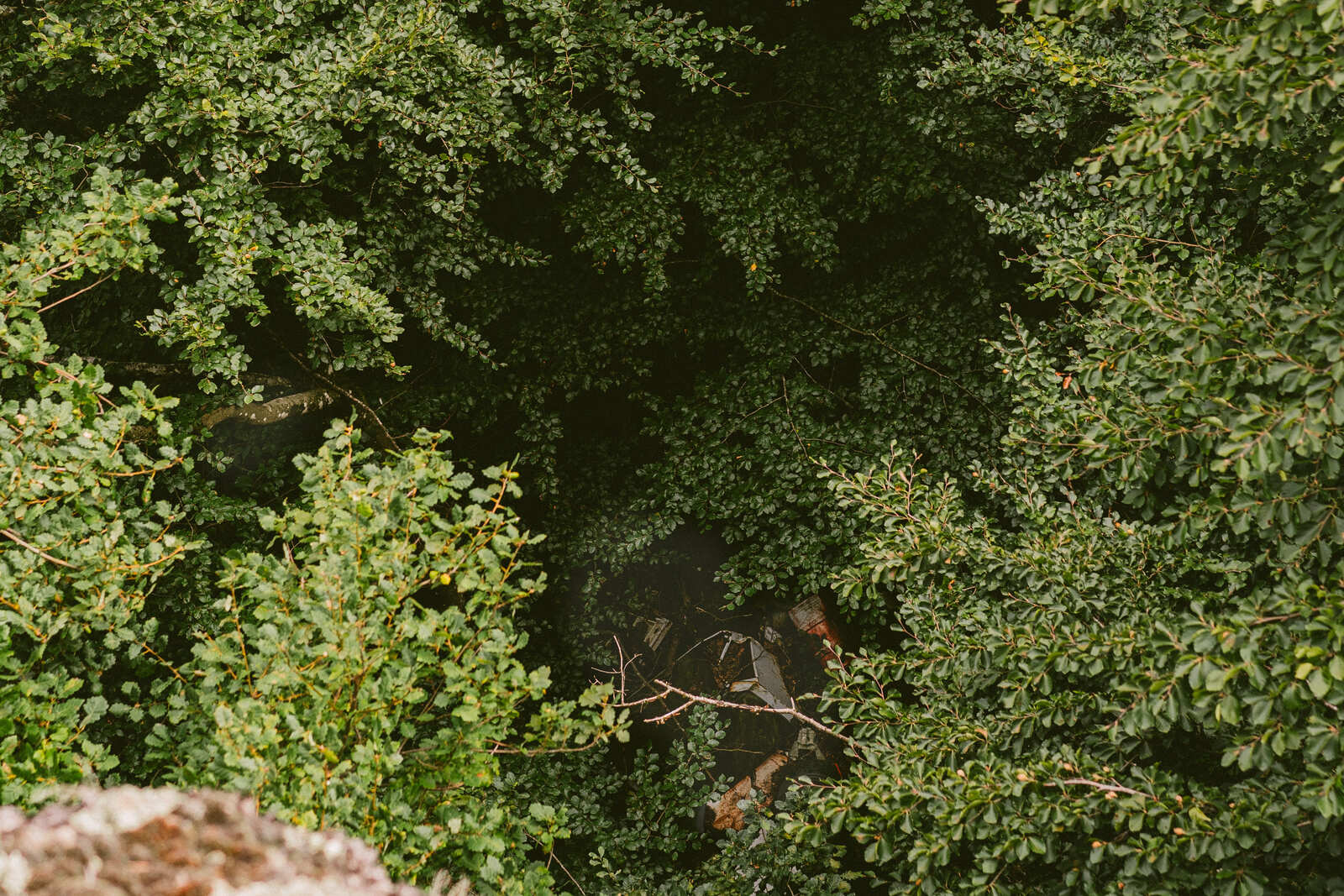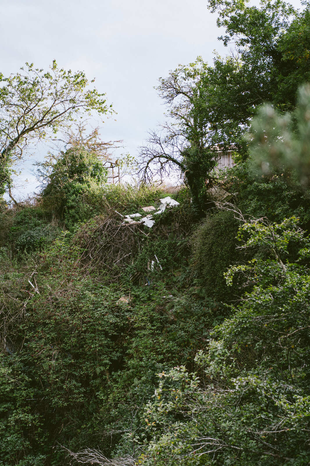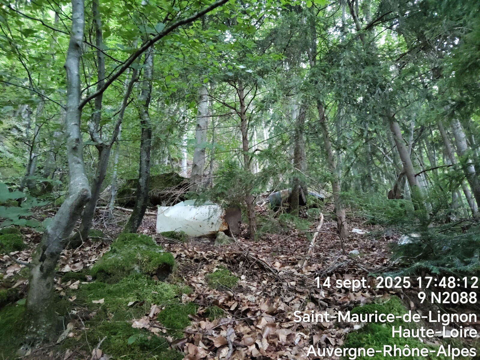 Nombreux déchets jetés dans la forêt de toutes tailles et matières.
