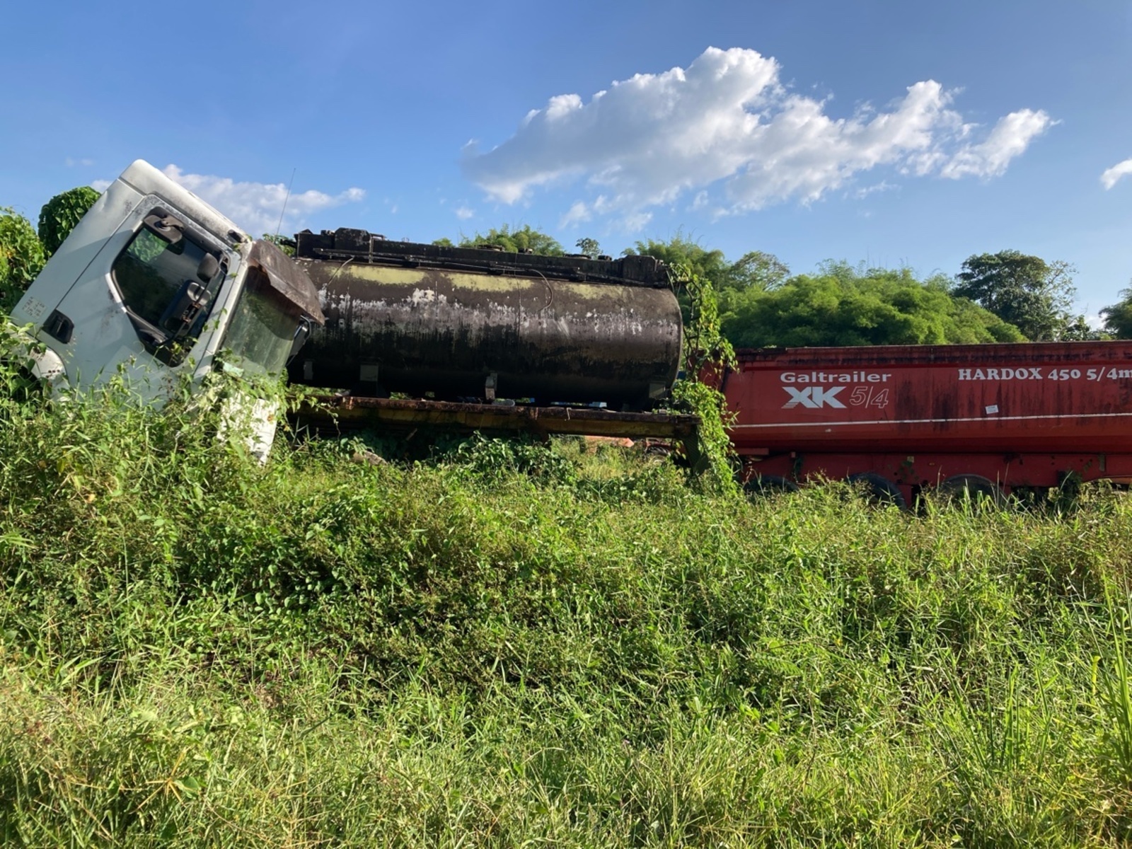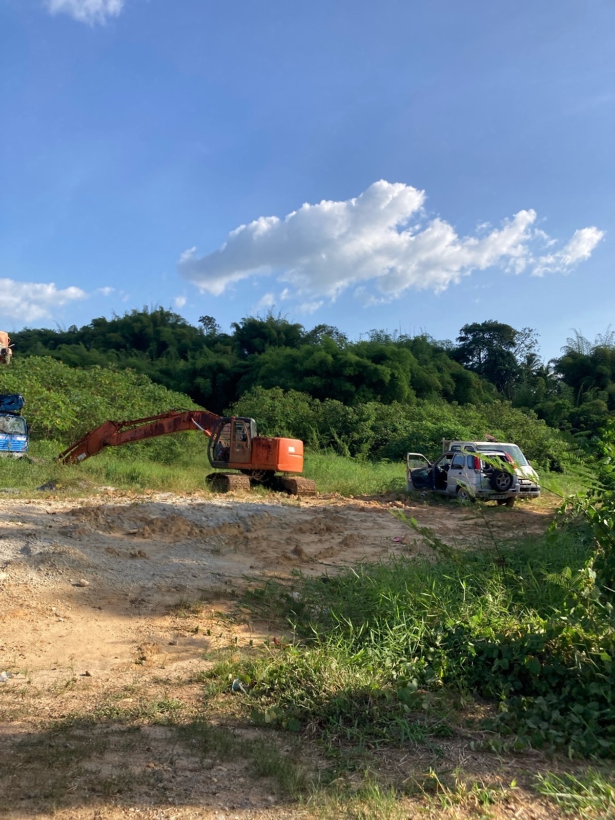 Un dépôt grande ampleur de véhicules hors d'usage a été signalé sur le bord d'une route accessible proche de Saint Jean. Sont présents : 4 gros camions, un VHU, 4 engins de chantier (pris dans la végétation) et une camionnette.