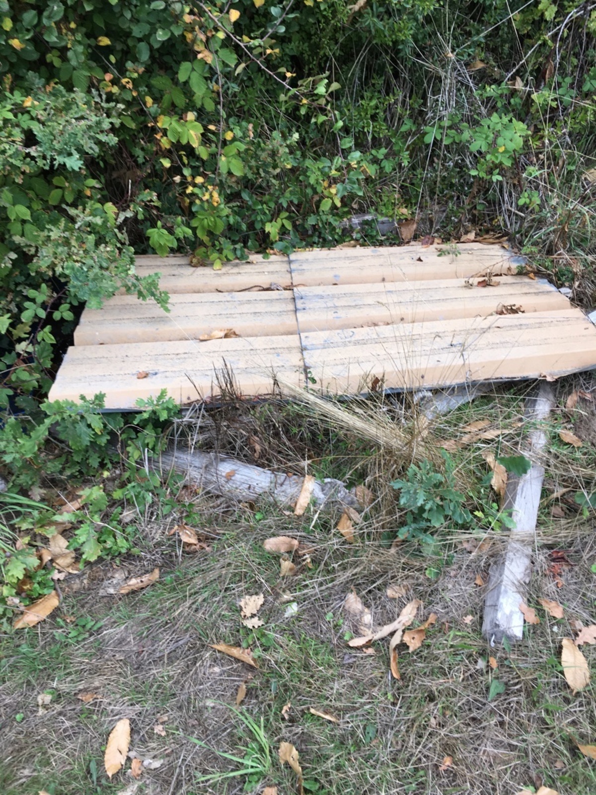Abandon de tôle de toit, bac en plastique et pieux en bois, au carrefour entre plusieurs chemins