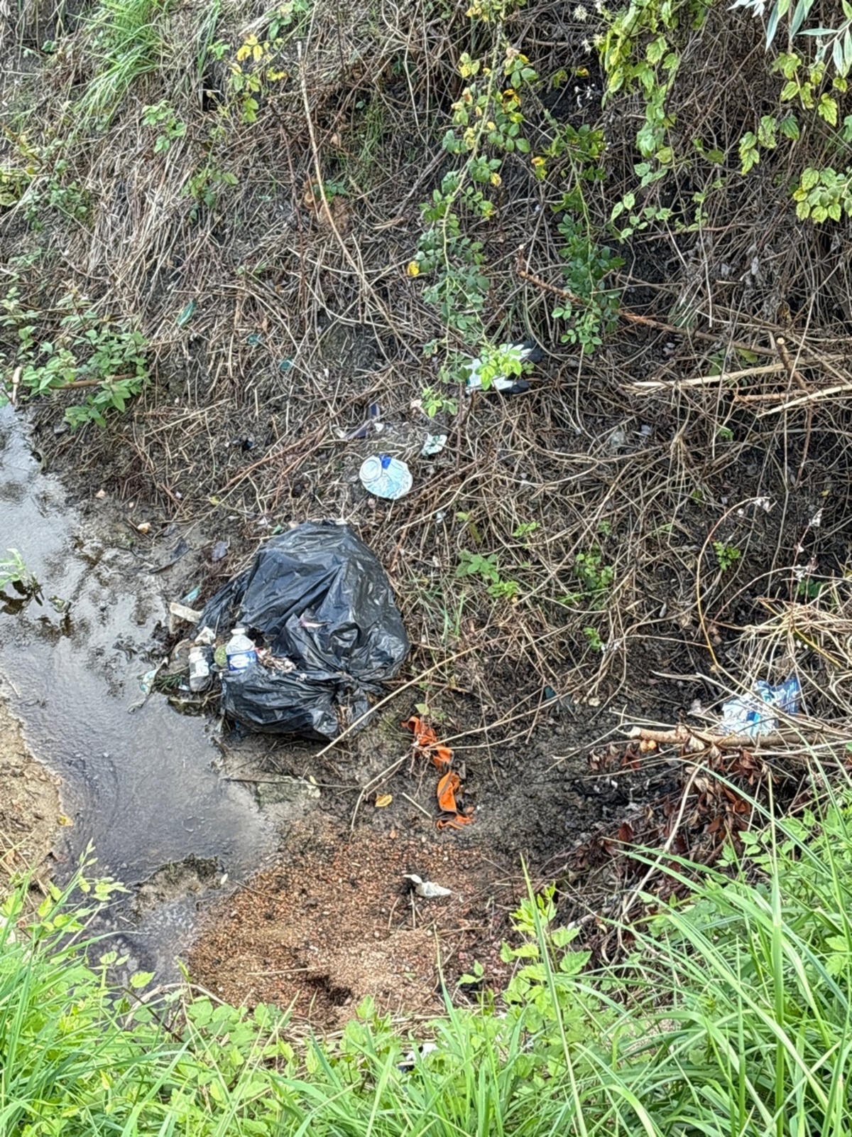 Sac poubelle éventré et présence de différents détritus en contre bas de chemin carrossable dans un fossé depuis plusieurs semaines.