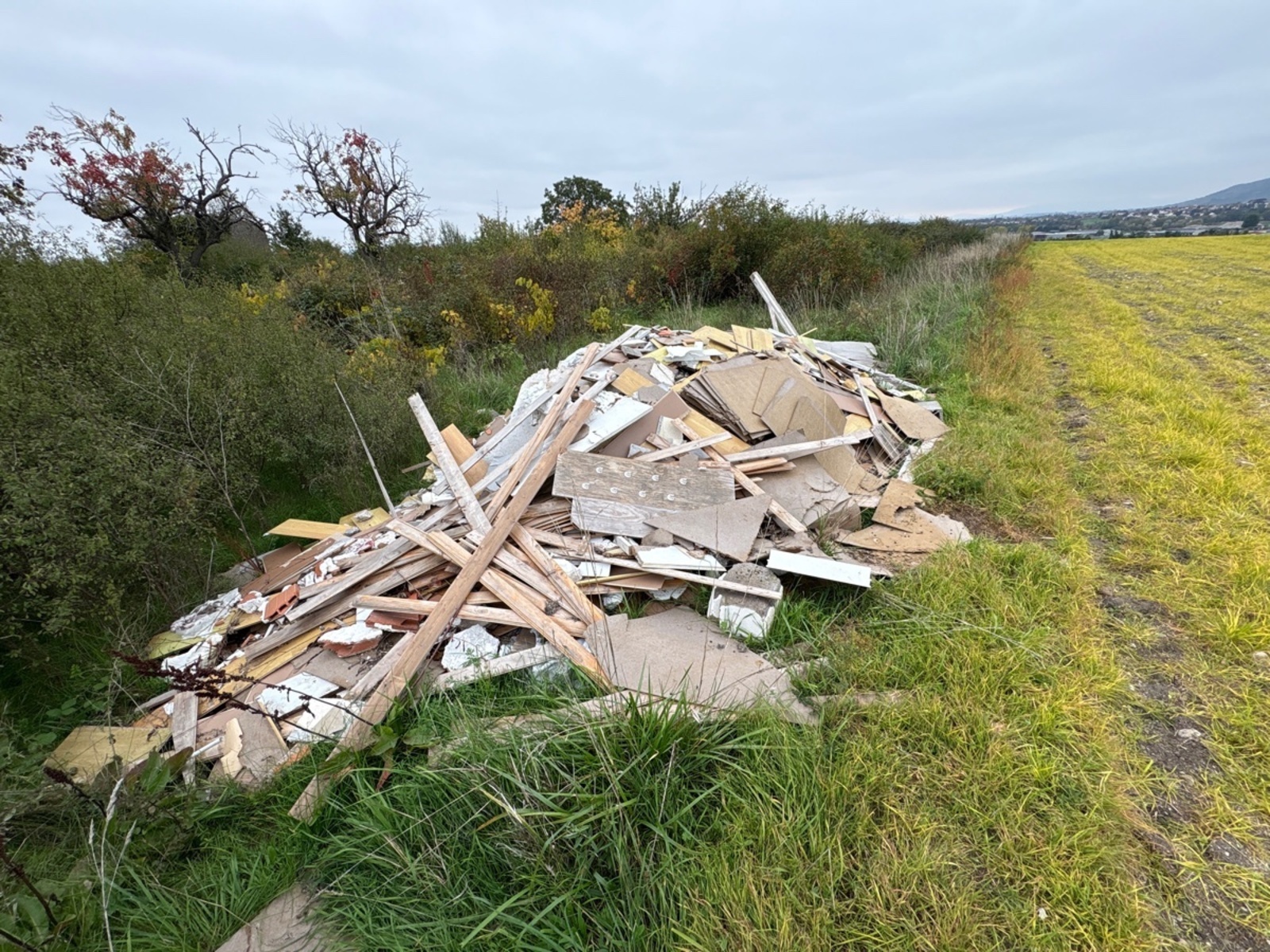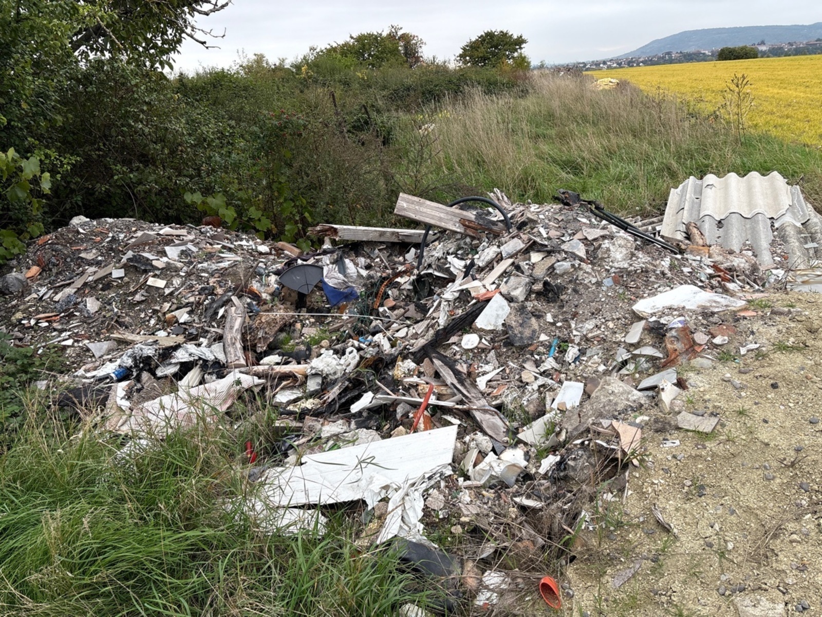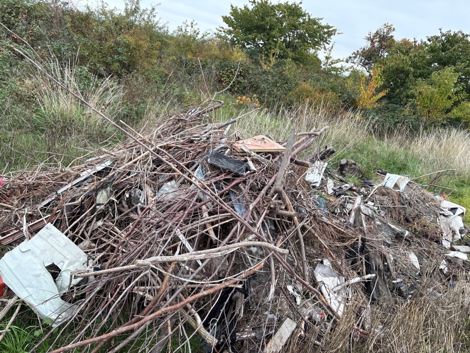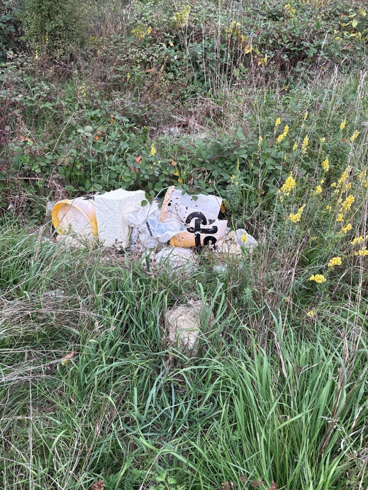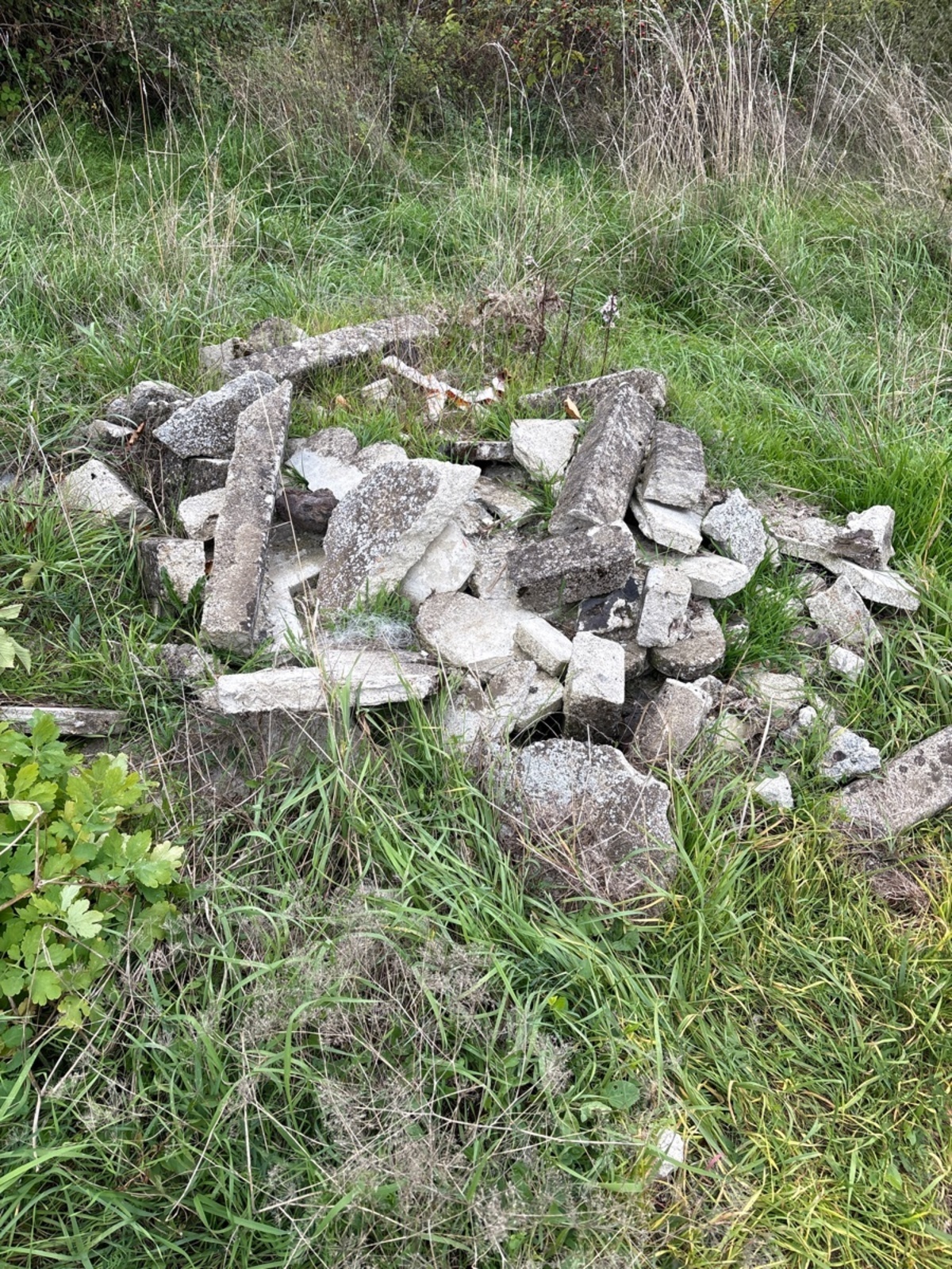 Zone intense de déchets sauvages dont des seaux de ciment usagé, des déchets de bois de construction, bétons, des emballages de chantier avec des gravats, d'autres déchets divers dont fibrociment amianté, des gravats bétonnés, bois, plastiques, pneu ...