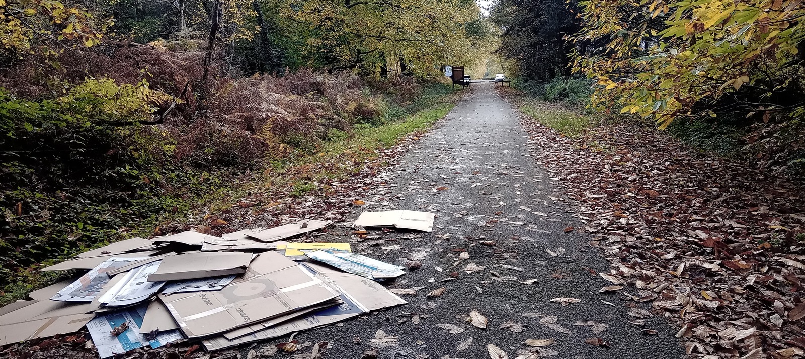 Déchets inertes en grande quantité de cartons d'emballage sur la route forestière du fond de l'Essart de la forêt de la Londe-Rouvray.