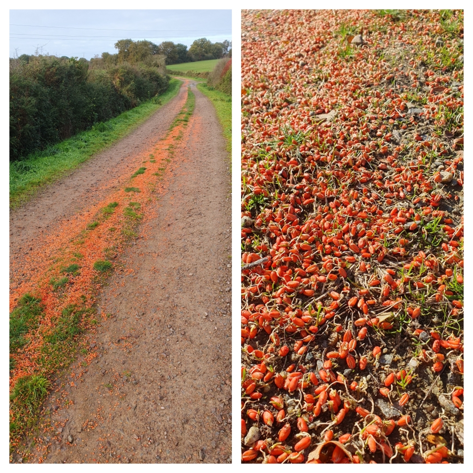 Un tracteur a perdu une partie de sa semences enrobées (grains de couleur orange).