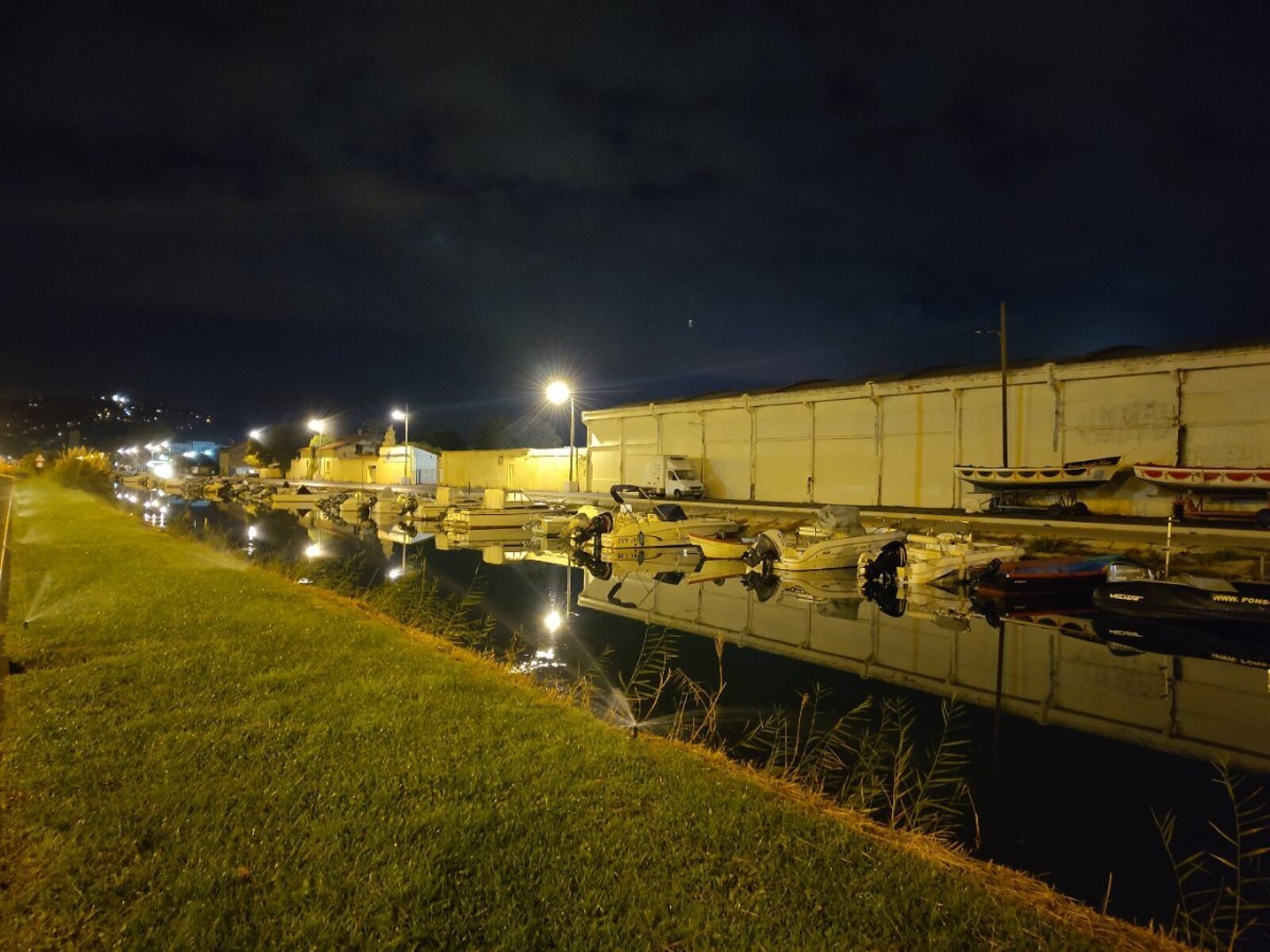 Lampadaires urbains éclairant directement un cours d'eau. Les cours d’eau qui passent sous nos ponts sont peuplés de plantes, d'insectes et de poissons qui, la nuit, ont besoin d’obscurité. Pour protéger cette biodiversité, l'éclairage direct des cours d'eau est interdit.