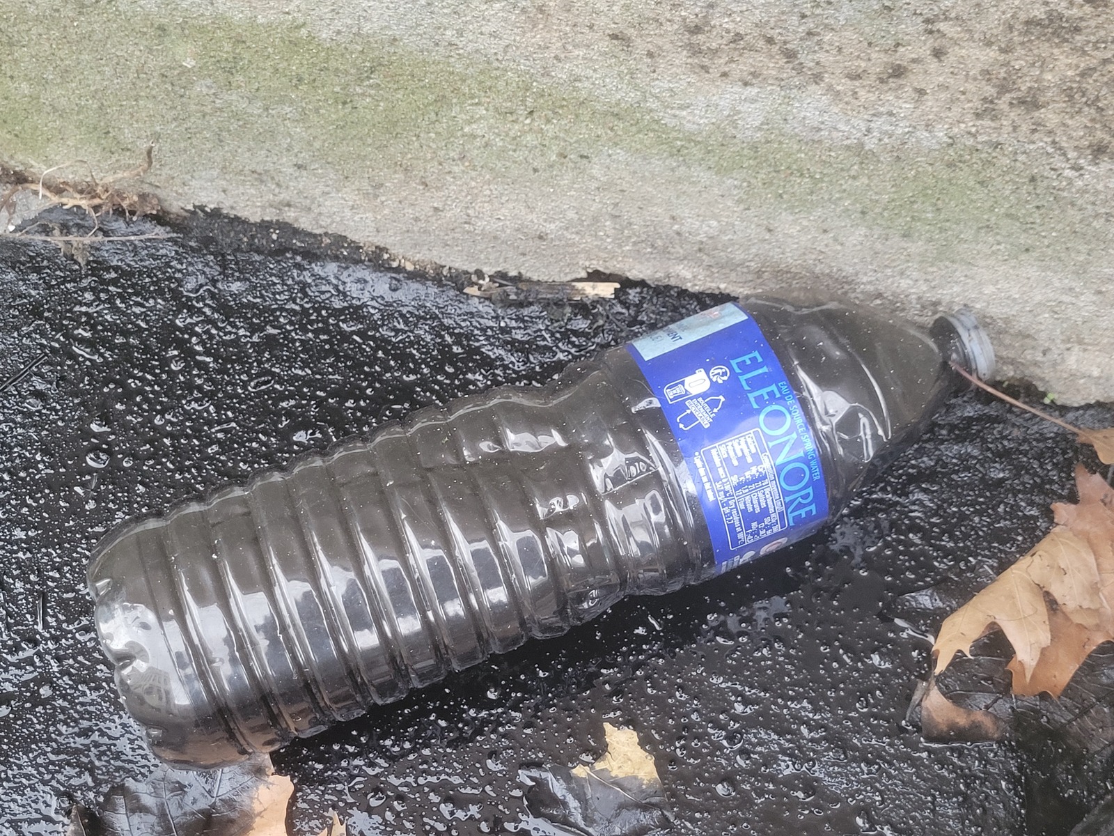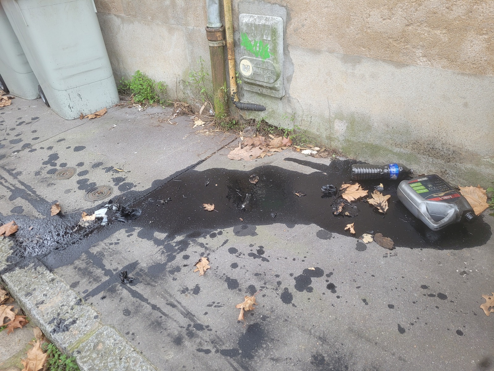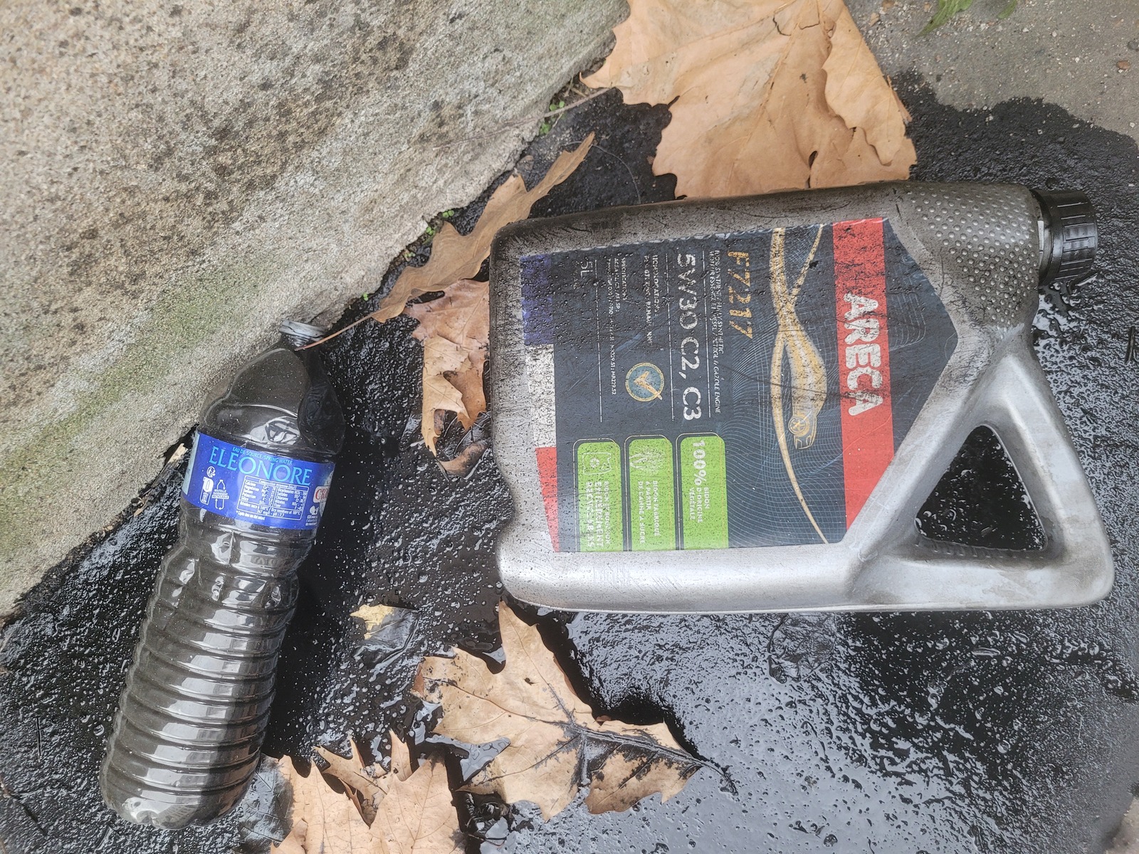 Abandon sur le trottoir d'un bouteille plastique et d'un bidon plastique contenant tous deux des produits d'entretien de voiture. Du liquide noir s'en échappe sur le trottoir. La mairie en a été alertée par notre sentinelle et est rapidement intervenue pour évacuer les produits polluants.