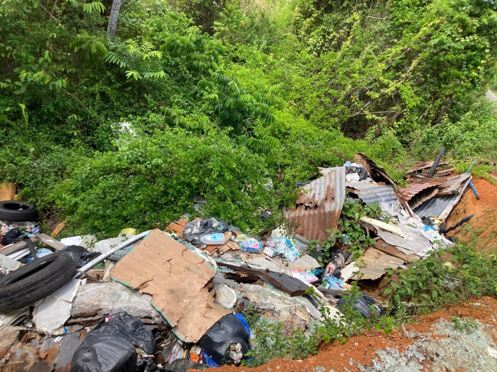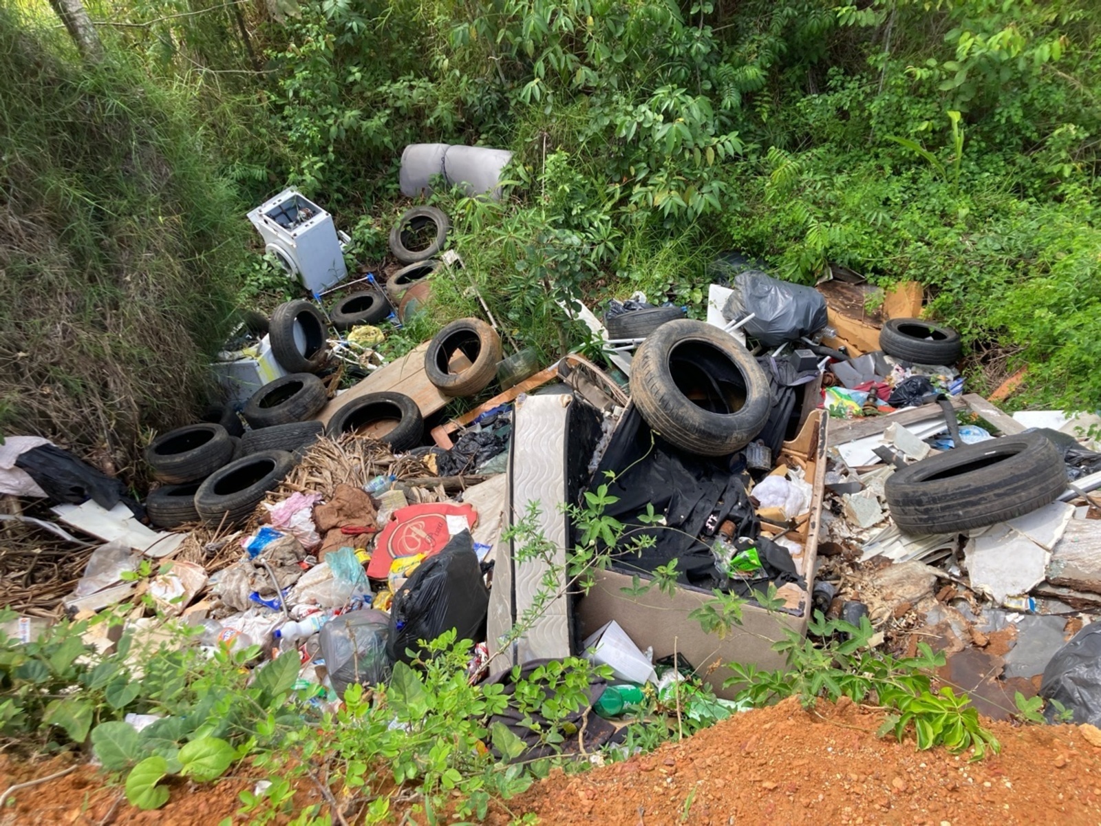 Un dépôt de déchets de grande ampleur et récurrent dans une fosse sur le bord d'une route a été signalé. Il est composé de ferraille, électroménagers (D3E), cartons et bois, d'une vingtaine de pneus de véhicules.