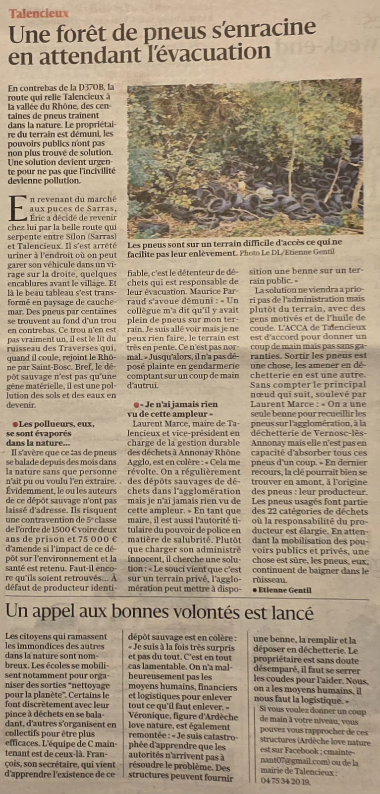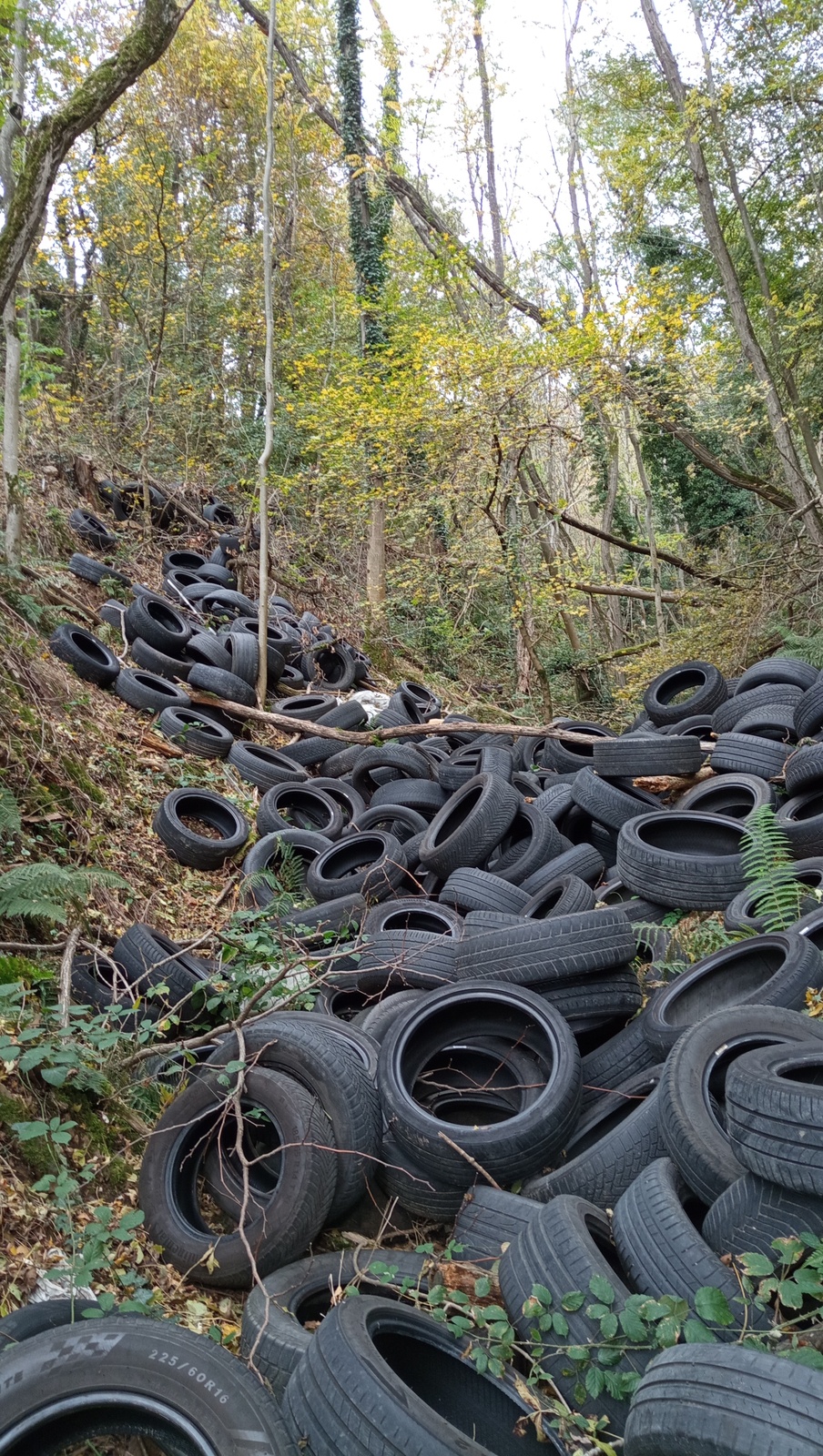 Une grande quantité de pneus jetés illégalement dans un vallon