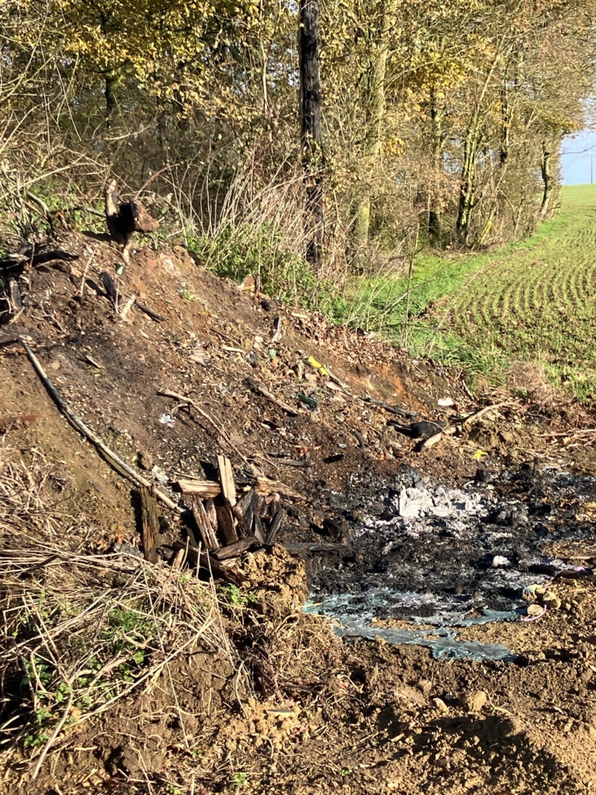 Brûlage de matières pouvant être valorisées (ex : bois) ainsi que de matières synthétiques (ex : présence visible de plastique). Ces pratiques sont totalement illicites.