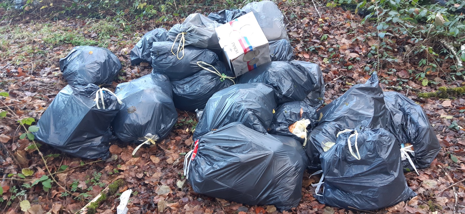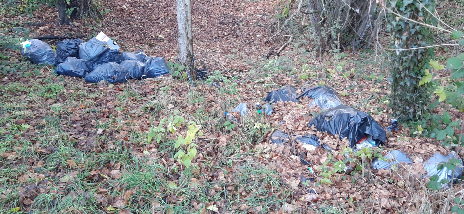 Dépôt d'une grande quantité de sacs de déchets ménagers. Le volume est estimé à 1m³.