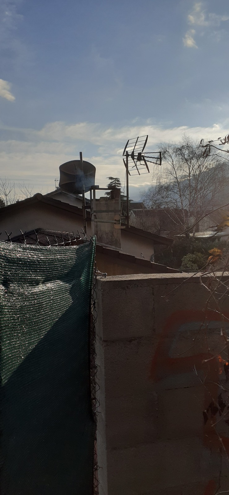 Habitation utilisant potentielement une cheminée à foyer ouvert, odeur de bois brûlé à proximité et vue de la fumée s’échappant du conduit de cheminée