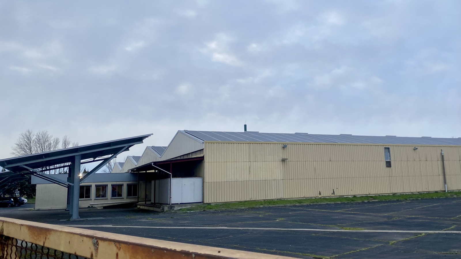 Ombrières photovoltaïques sur la toiture et le parking d'un bâtiment industriel.