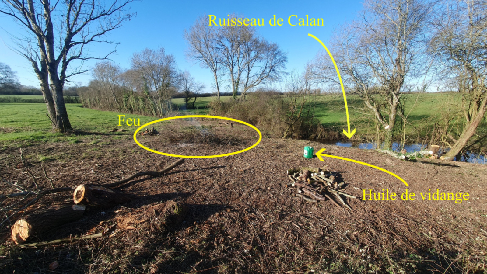 Brûlage de végétaux avec de l'huile de vidange en bordure de ruisseau