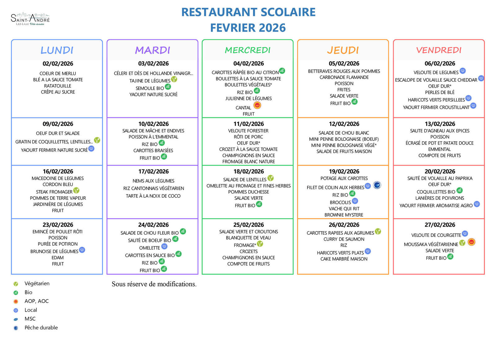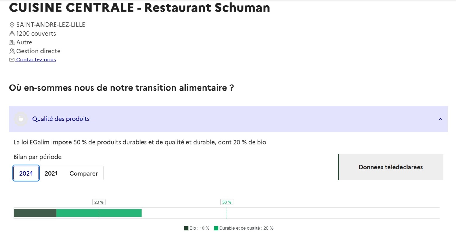 Vous trouverez ici le menu des écoles de St André pour le mois de février. PLusieurs aliments sont bio. Pour approfondir je suis allée comme proposé sur le site de ma cantine et j'ai découvert que les 1200 plats étaient pris en charge par une cuisine centrale et que 10 % des aliments proposés étaient bio soit en dessous de ce qu'impose la loi Egalim. Je pense écrire un courrier à la mairie pour leur demander les raisons et leur demandé également pourquoi ce résultat a baissé (11% dans la déclaration précédente) Vous trouverez la photo du menu en pj ainsi que la copie d'écran du site macantine : https://ma-cantine.agriculture.gouv.fr/nos-cantines/65778--CUISINE%2520CENTRALE%2520-%2520Restaurant%2520Schuman