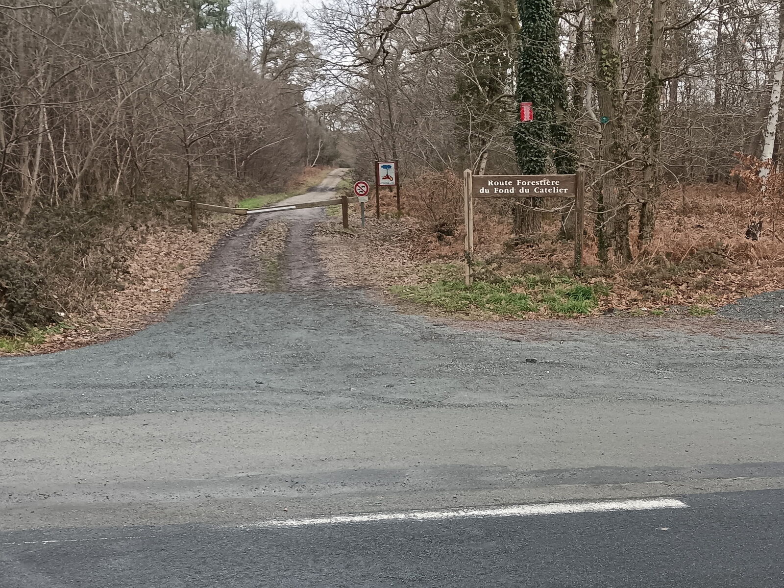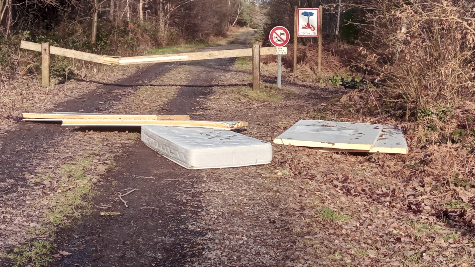 Dépôt de planches de MDF et d'un matelas devant les barrières à l'entrée du chemin de Catelier de la forêt de la Londe, bloquant l'accès.