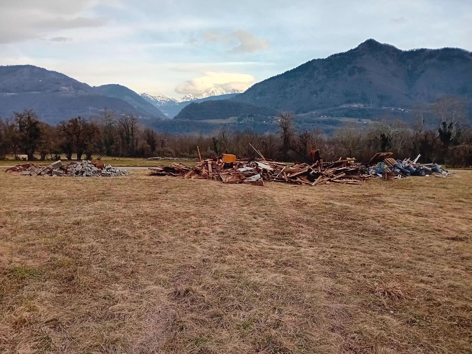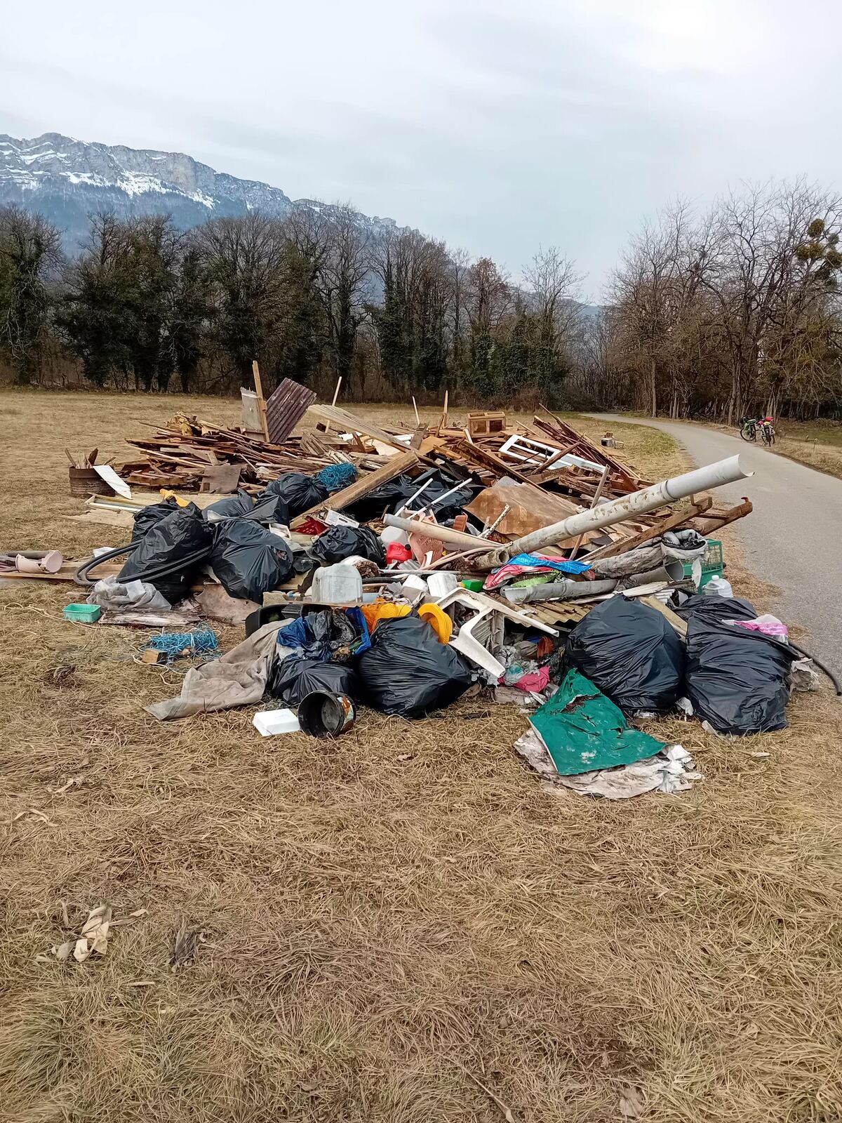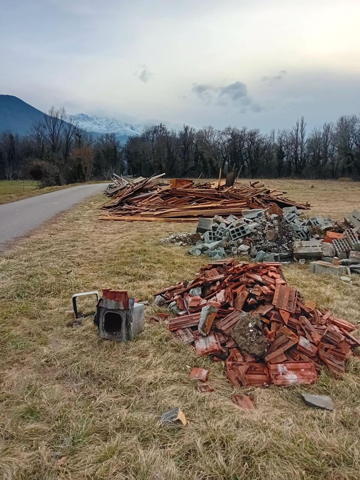 Important dépôt de déchets de démolition à proximité : bois, gravats, sacs d'ordure, ...