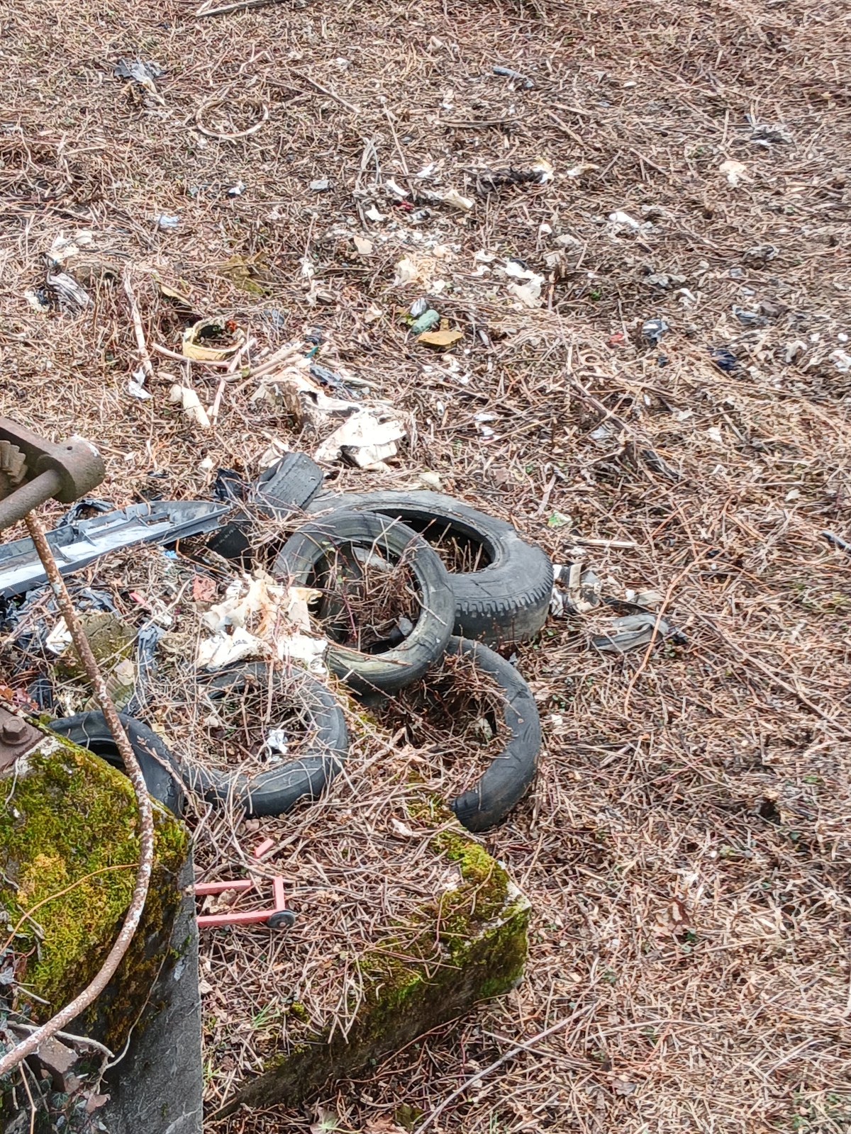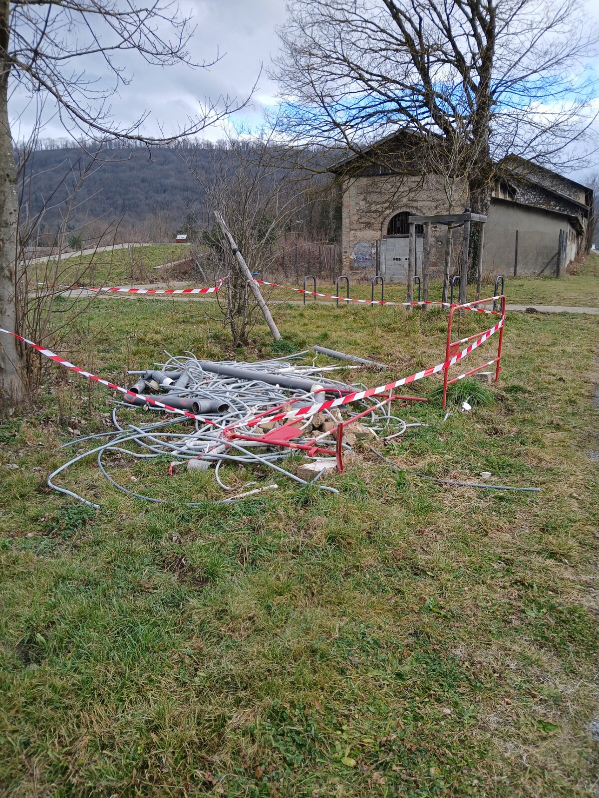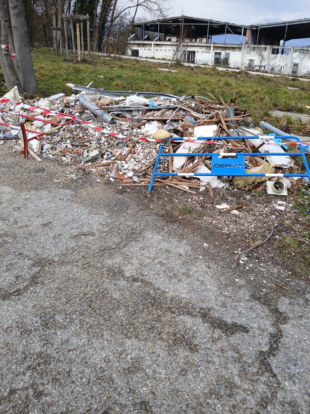 Plusieurs dépôts sauvages le long du chemin de l'ancienne papeterie: gravats, pneus, laine de verre, gaines d'électricité, tuyaux, polystyrène, etc. Rien n'a été enlevé depuis fin novembre et les déchets s'envolent dans la végétation et le ruisseau. Contraste avec les actions misent en place sur le site en faveur de la biodiversité (mare, panneaux d'informations, etc).