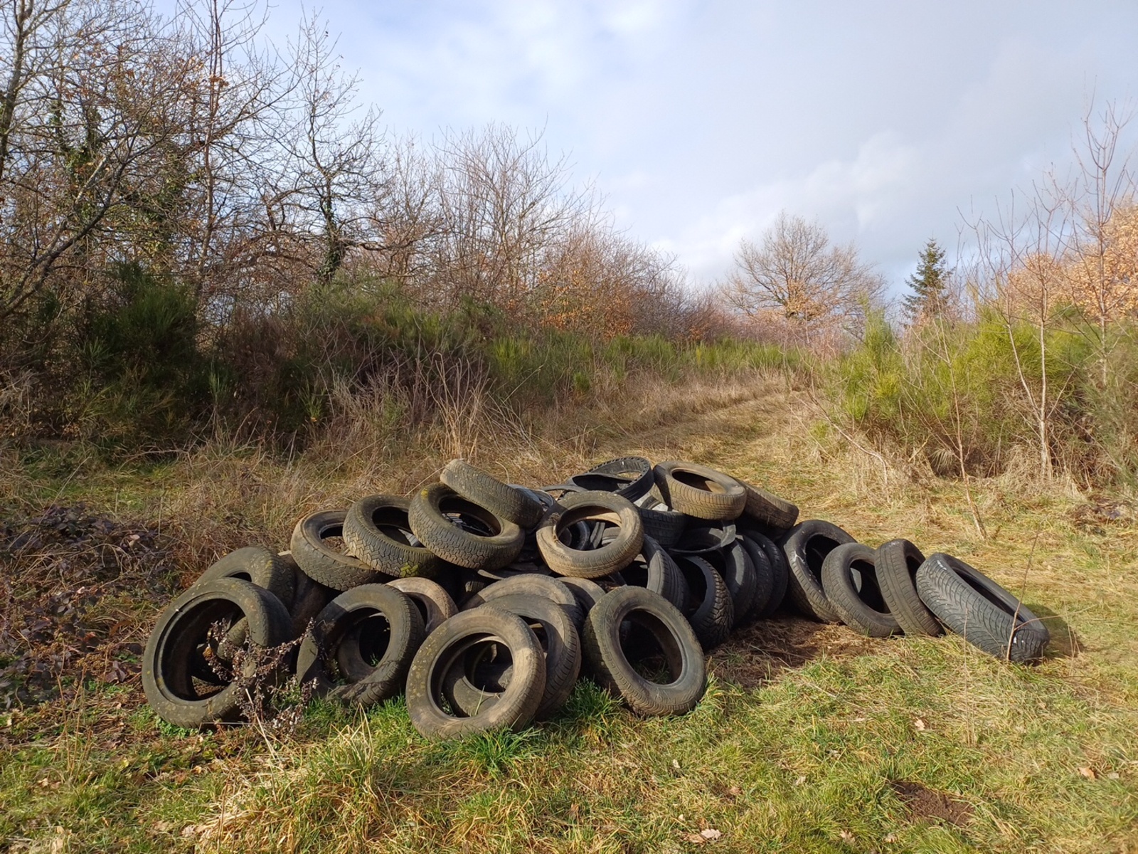 Dépôt de pneus tourisme et un petit tas de gravats.