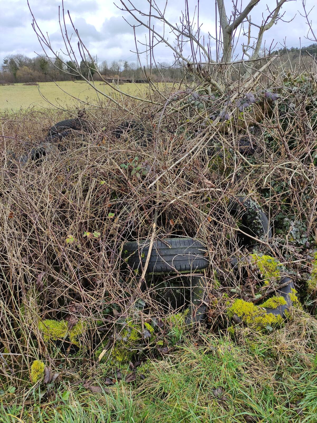 Présence de pneus déposés sous une haie, le long d'un pâturage bovin.