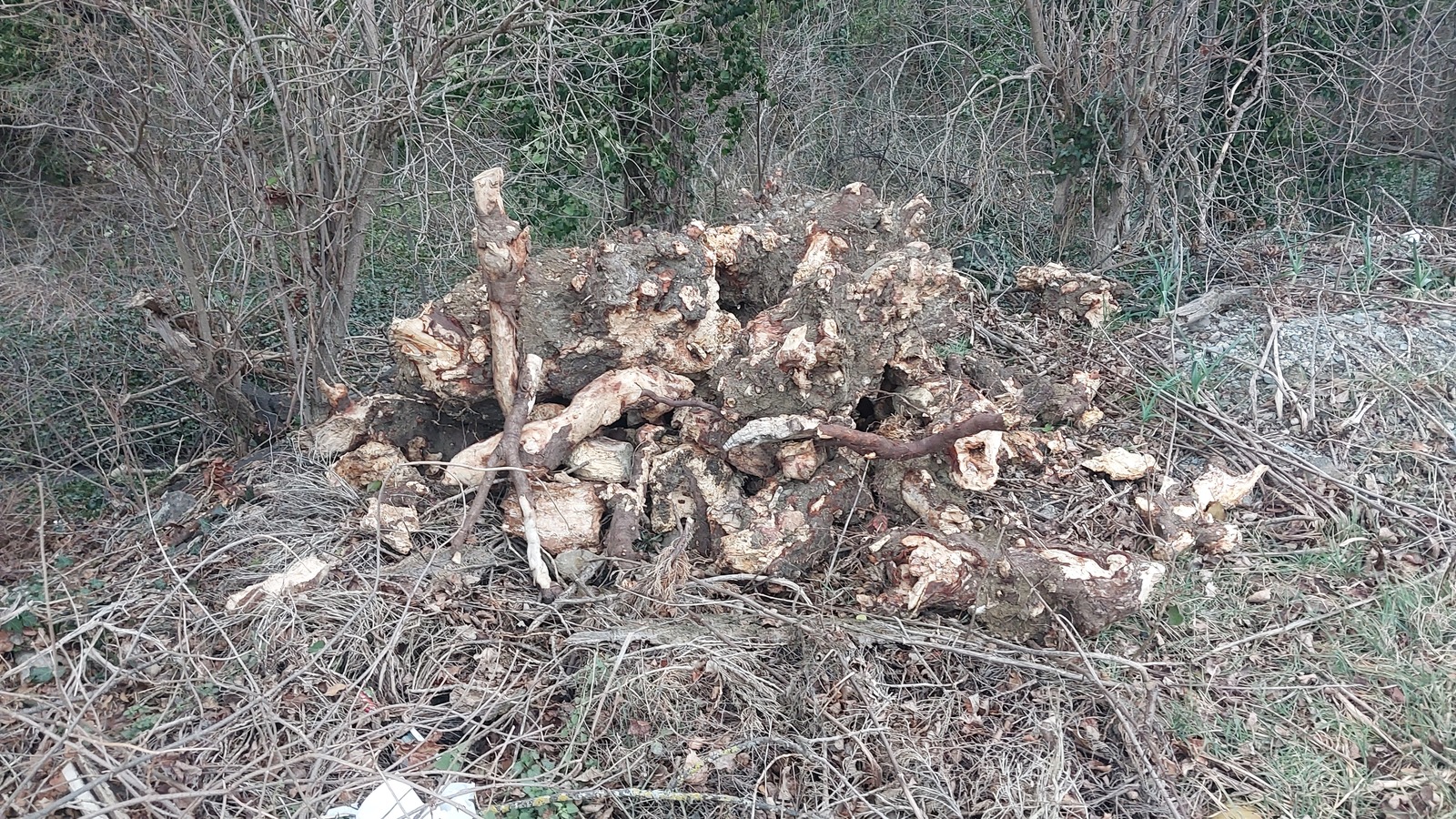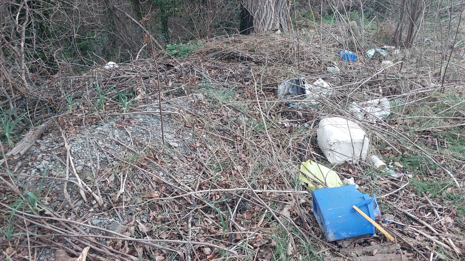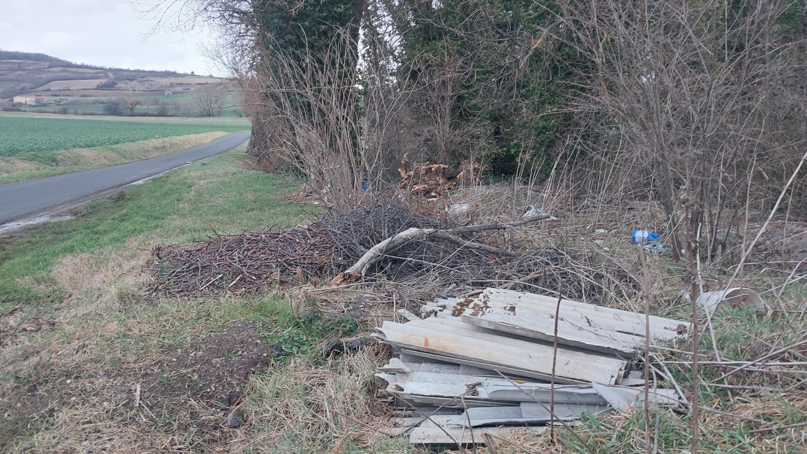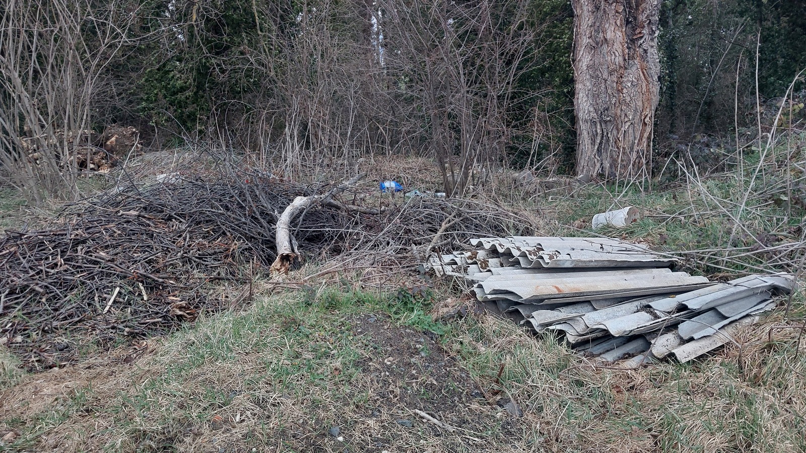Dépôt de plaques d'amiante + nombreux déchets plastiques et déchets verts (branches + grosses souches...)