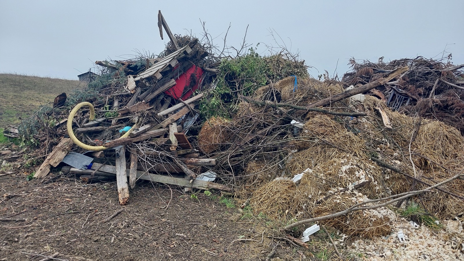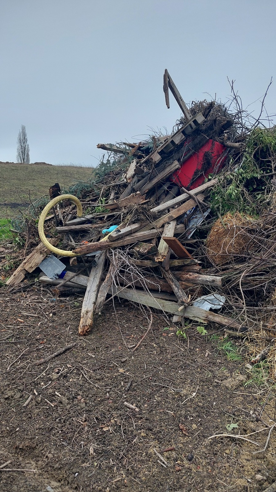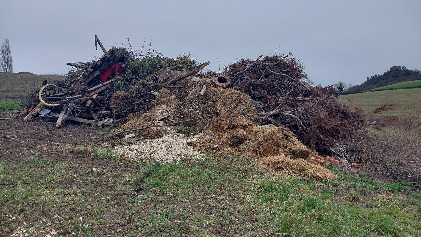 Tas de végétaux mélangé avec des déchets en tout genre, prêt à bruler... Au milieu d'une prairie, à proximité d'une zone humide répertoriée.