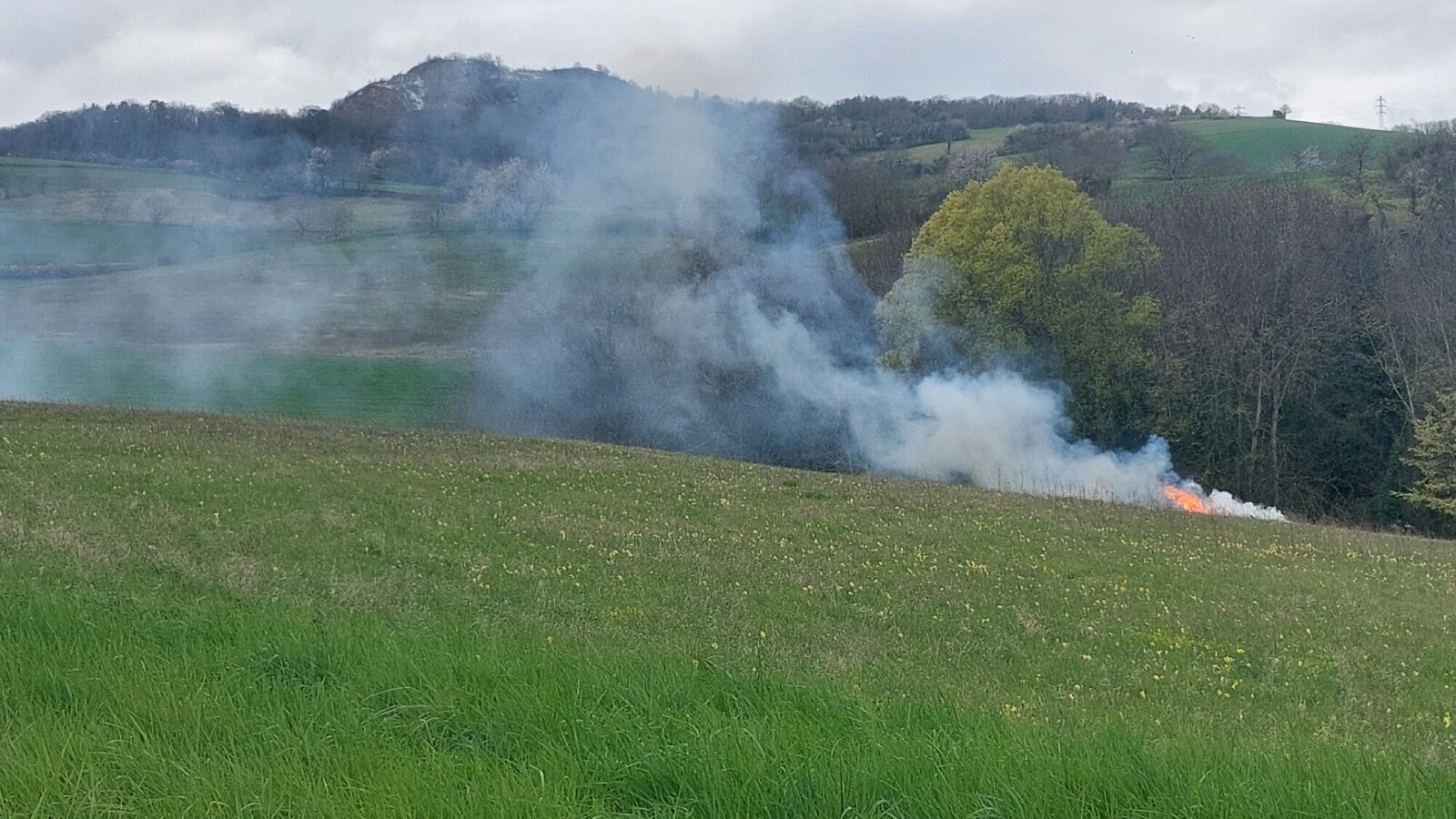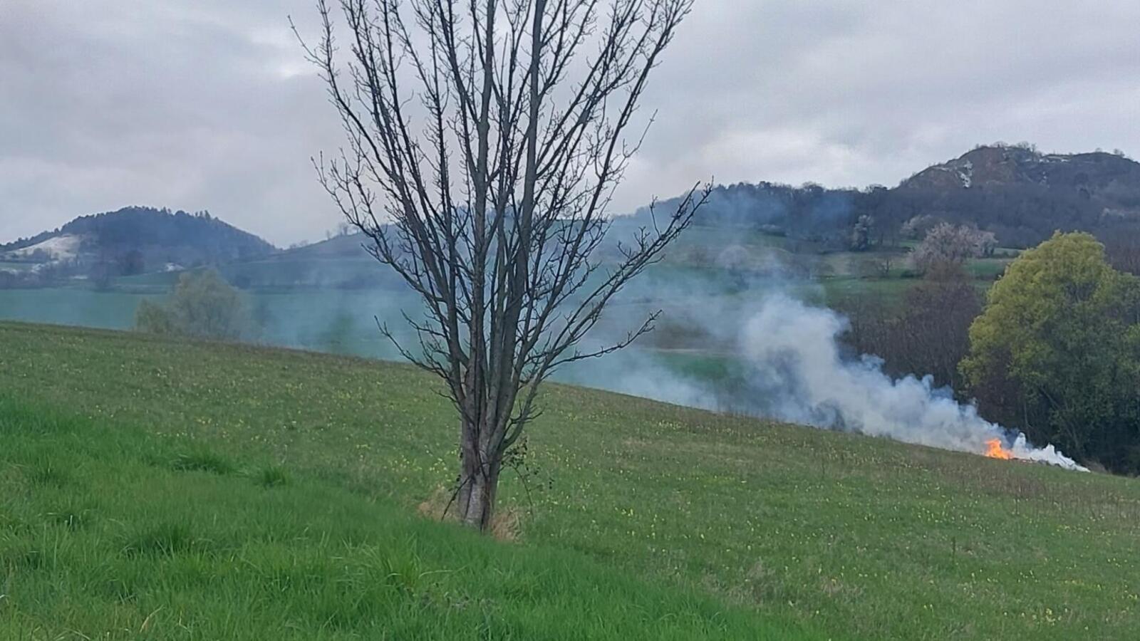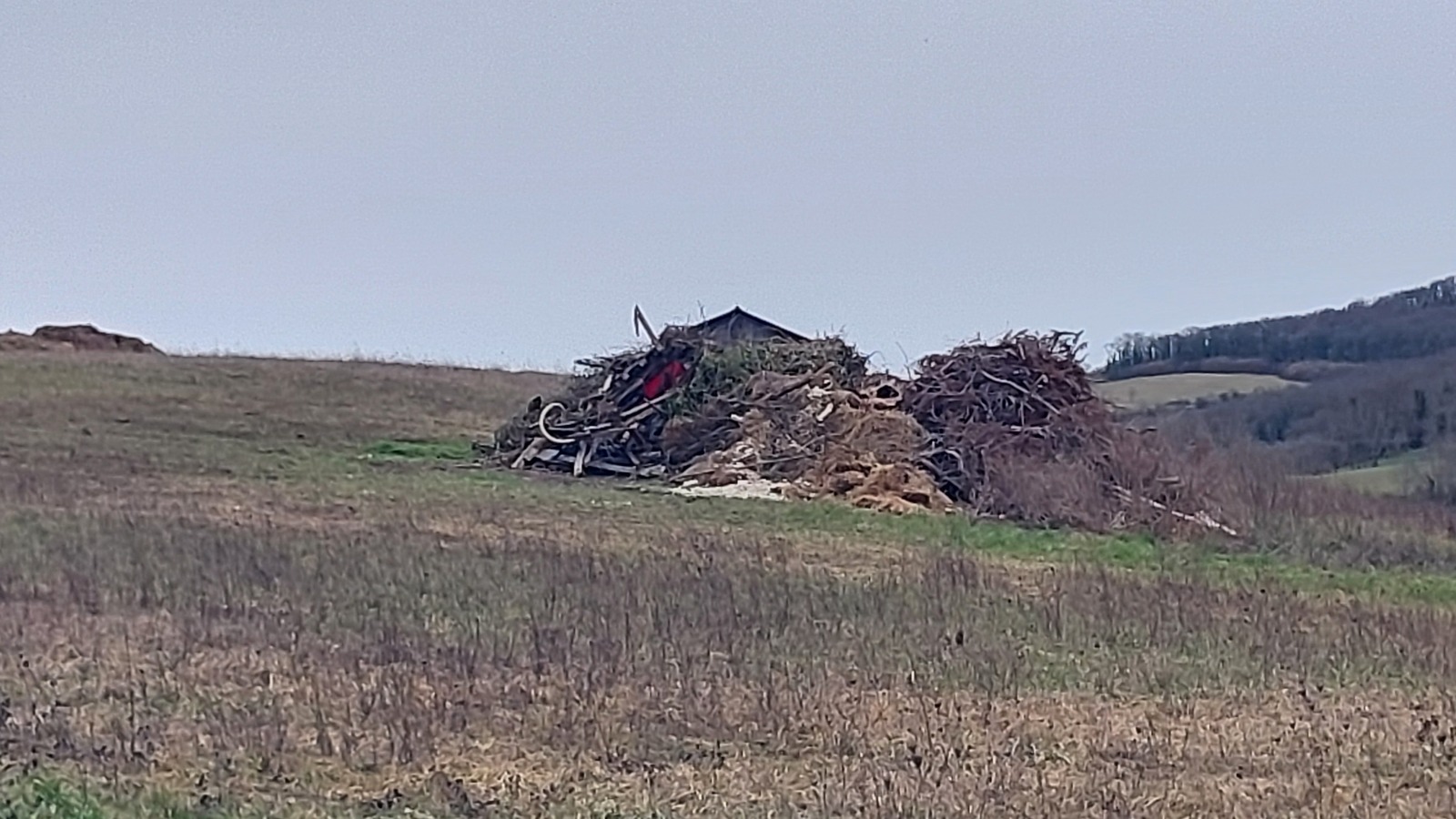 Tas de végétaux mélangé avec des déchets en tout genre, prêt à bruler... Au milieu d'une prairie, à proximité d'une zone humide répertoriée.