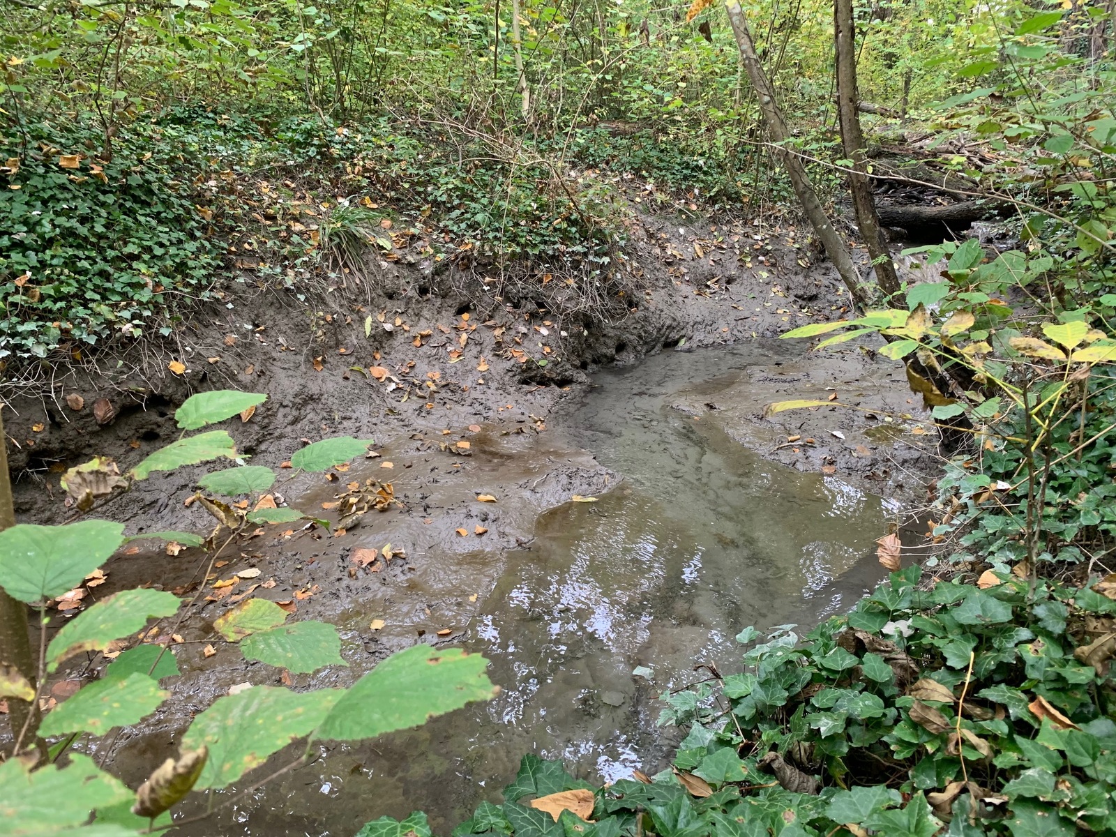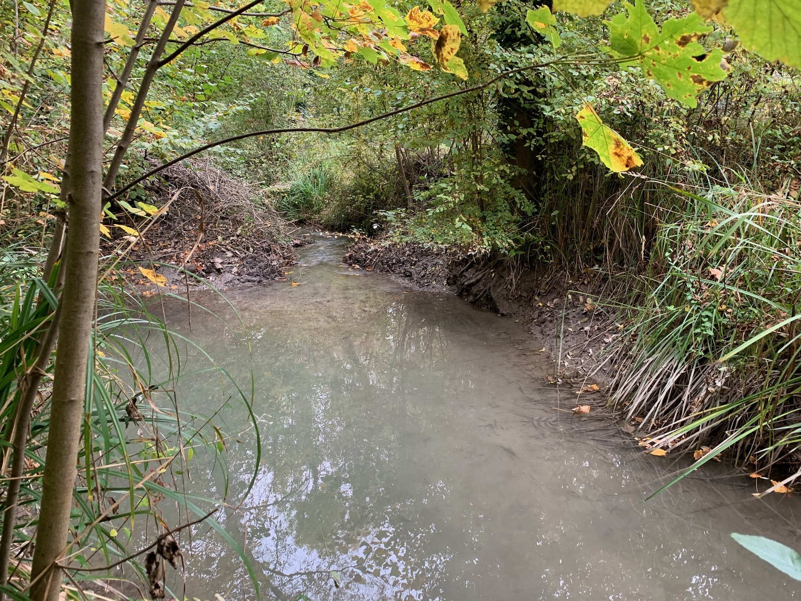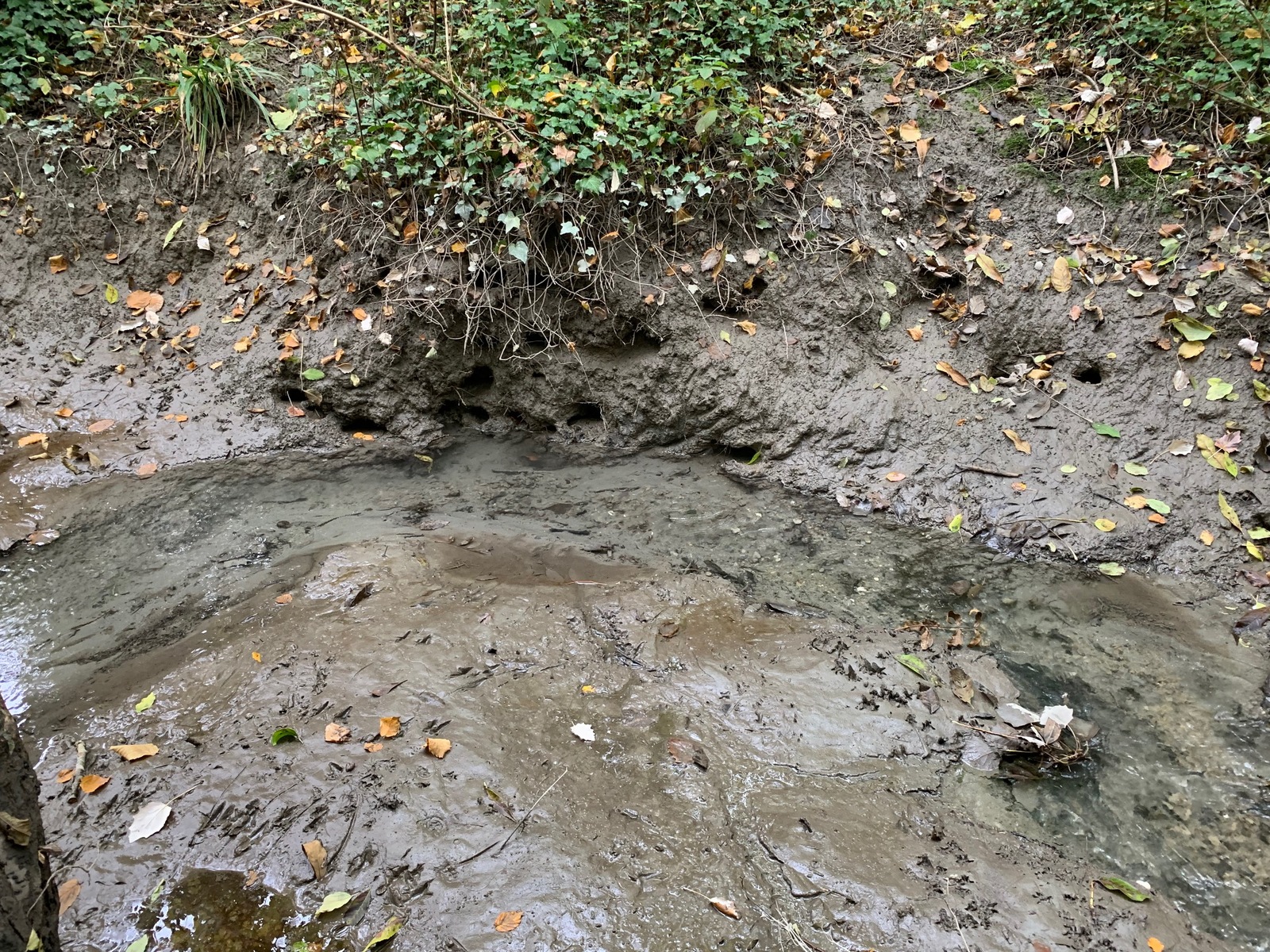 Lors d’une nouvelle visite 2 semaines plus tard, soit le 11/10, j’ai constaté la destruction totale du barrage. Le niveau du cours d'eau a baissé d'un mètre, quelques poissons évoluent dans une vingtaine de centimètres, les trous d'écrevisses sont visibles sur la berge. Quelques traces de pattes, mais aucune idée de ce qu'ont pu devenir les castors.