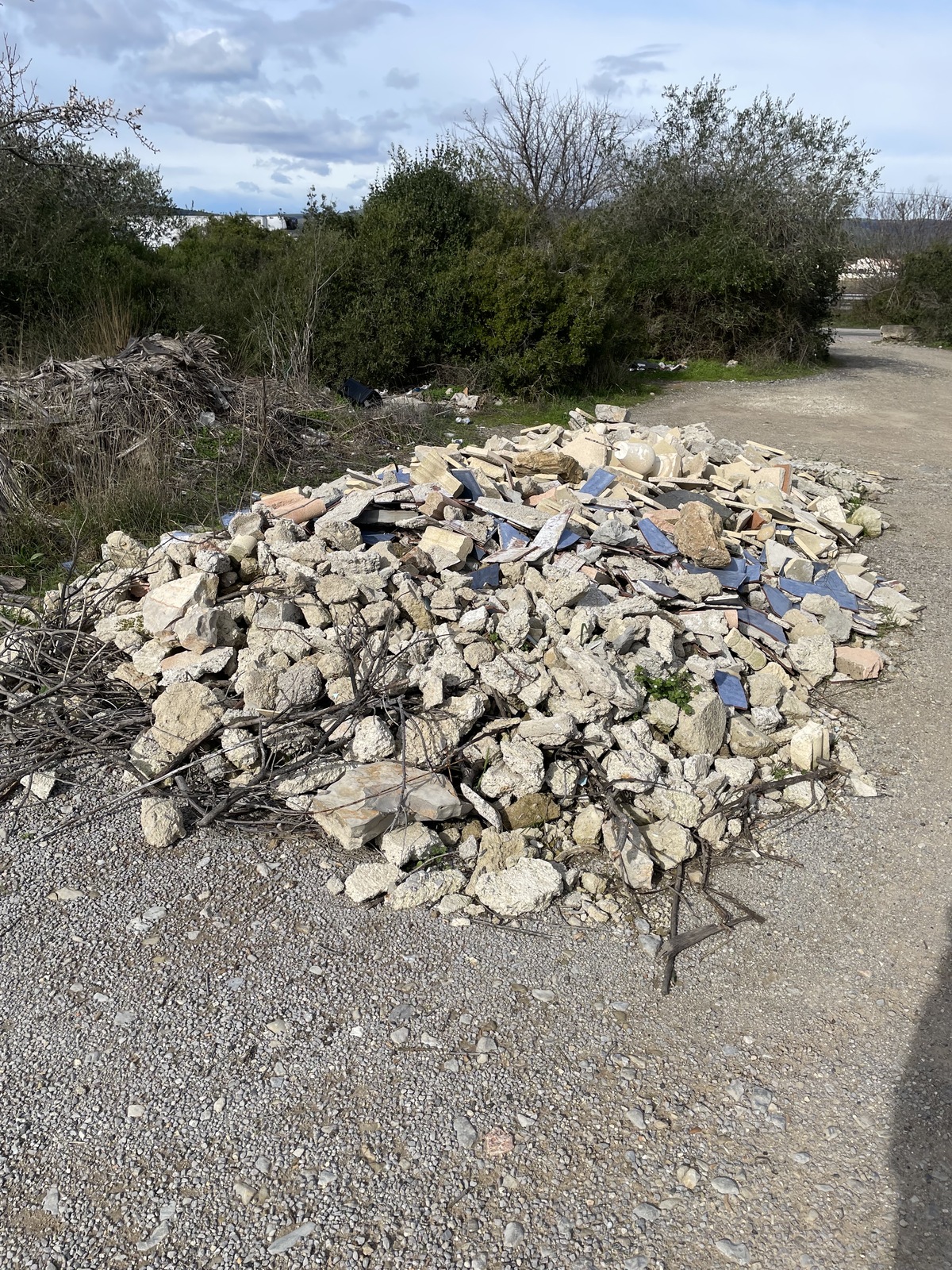 Dépôt sauvage de déchets de construction sur une petite route le long de la Languedocienne.