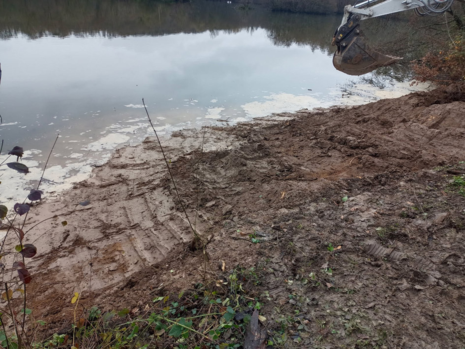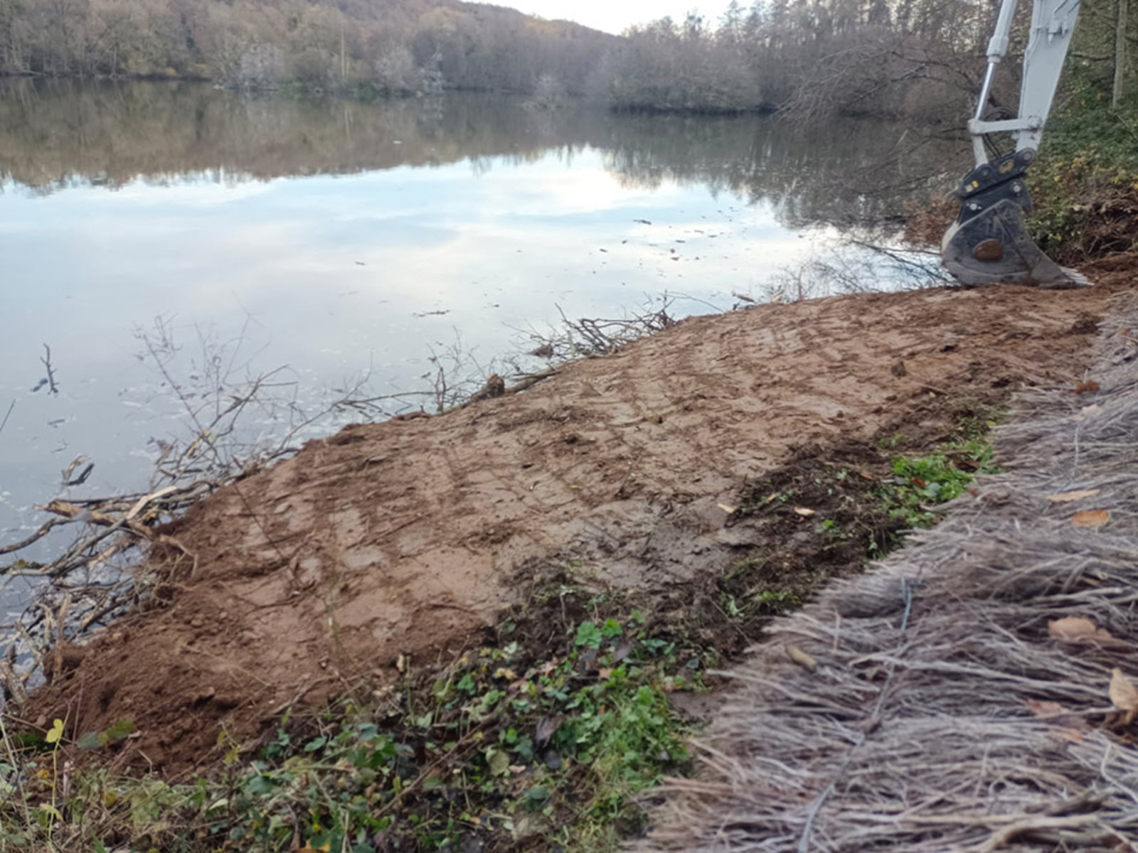 Etant donné l’exploitation en carrière de granulats, les berges de la gravière sont abruptes avec une profondeur d’environ 1m à 1m50. L’objectif était est de créer une berge en pente douce favorable à l’expression d’une ceinture de végétation hélophyte, favorable aux odonates et aux limicoles.