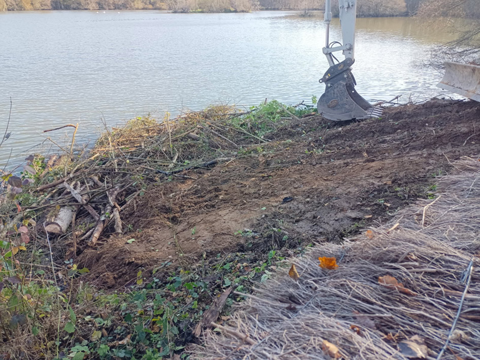 La berge créée mesure environ 12 mètres de large sur 5 mètres d’avancée dans la gravière, avec une pente de 30%. Actuellement, la moitié de la nouvelle berge est immergée, mais le niveau d’eau n’est pas encore à son niveau d’eau maximum hivernal et l’aménagement devrait se tasser. Une végétation rivulaire devrait s’installer et être favorable à la faune. Pour faciliter la végétalisation de cette berge, des graines d’hélophytes récoltées dans le secteur ont été semées et des rhizomes d’Iris des marais plantés.