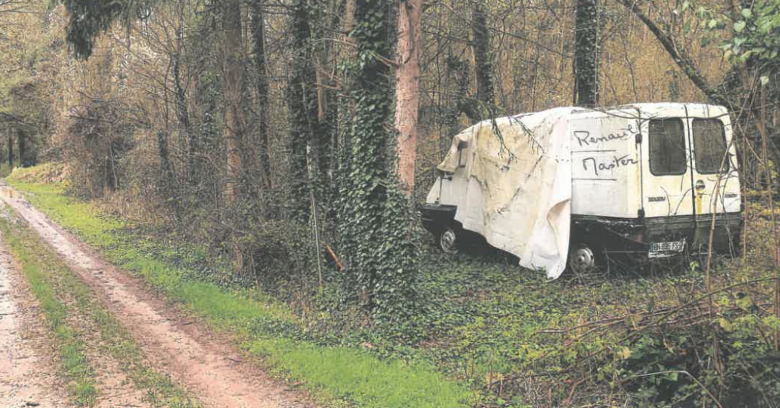 Épave d'un véhicule de type Renault Master dans une parcelle boisée