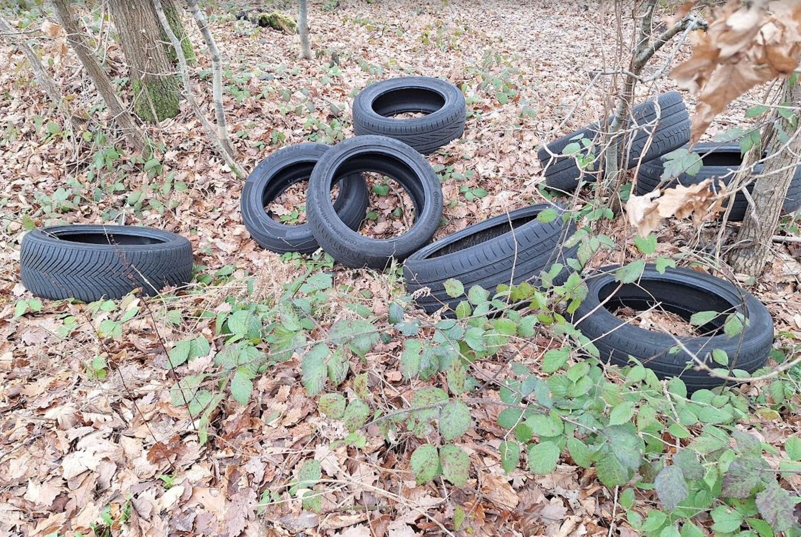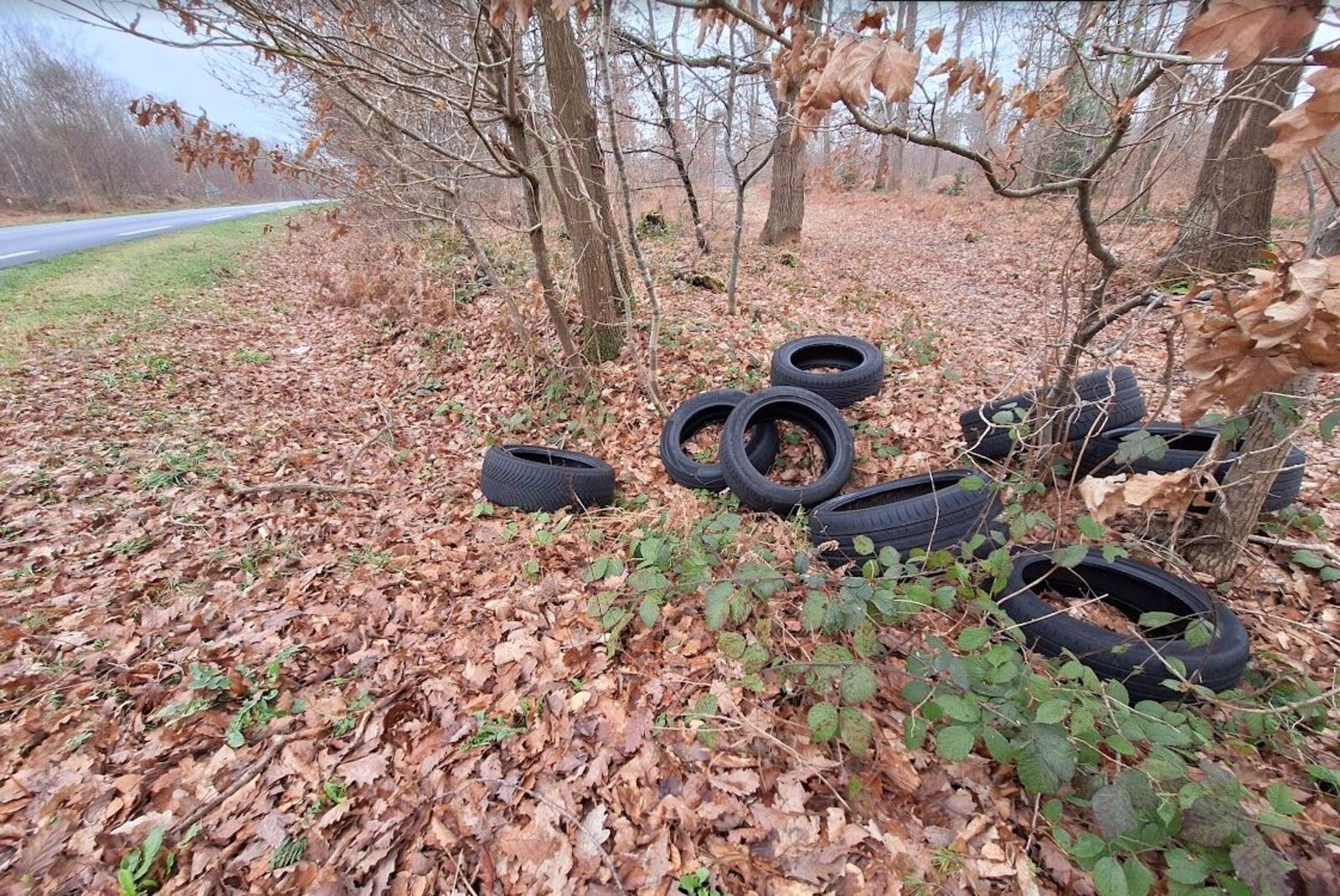 Dépôt sauvage d'une dizaine de pneus à l'entrée de la forêt domaniale de Brotonne le long de la D913, avant l'aire du chêne cuve en se dirigeant vers le pont de Brotonne.