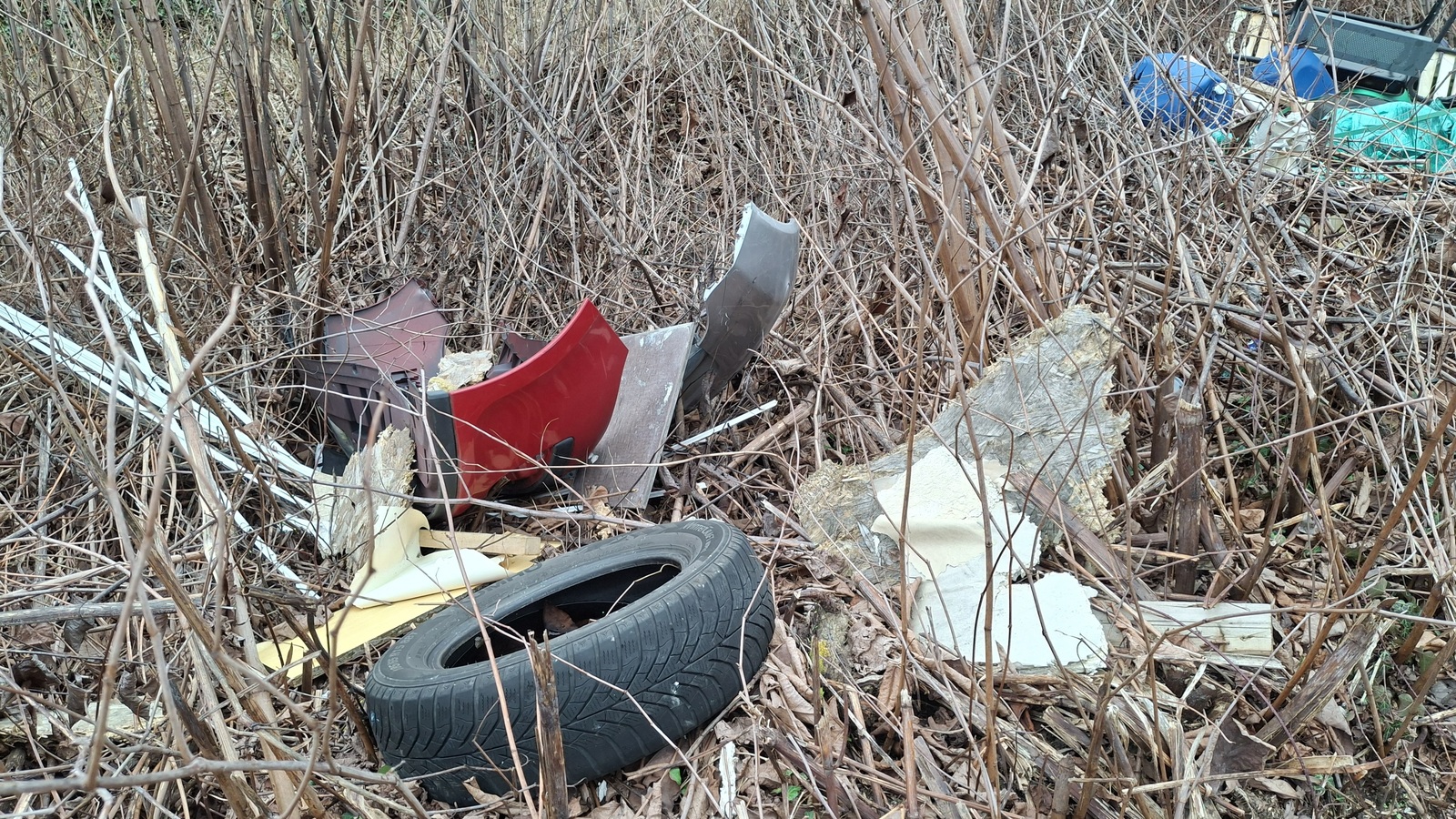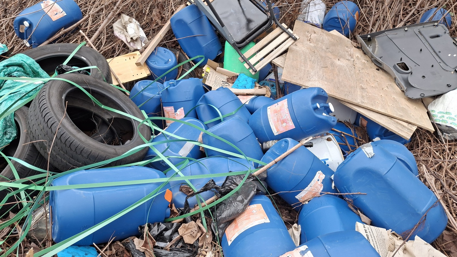 Type de déchets : une vingtaine de bidons de produits chimiques, pneus, meubles, tôles, vêtements, cartons, vrac...