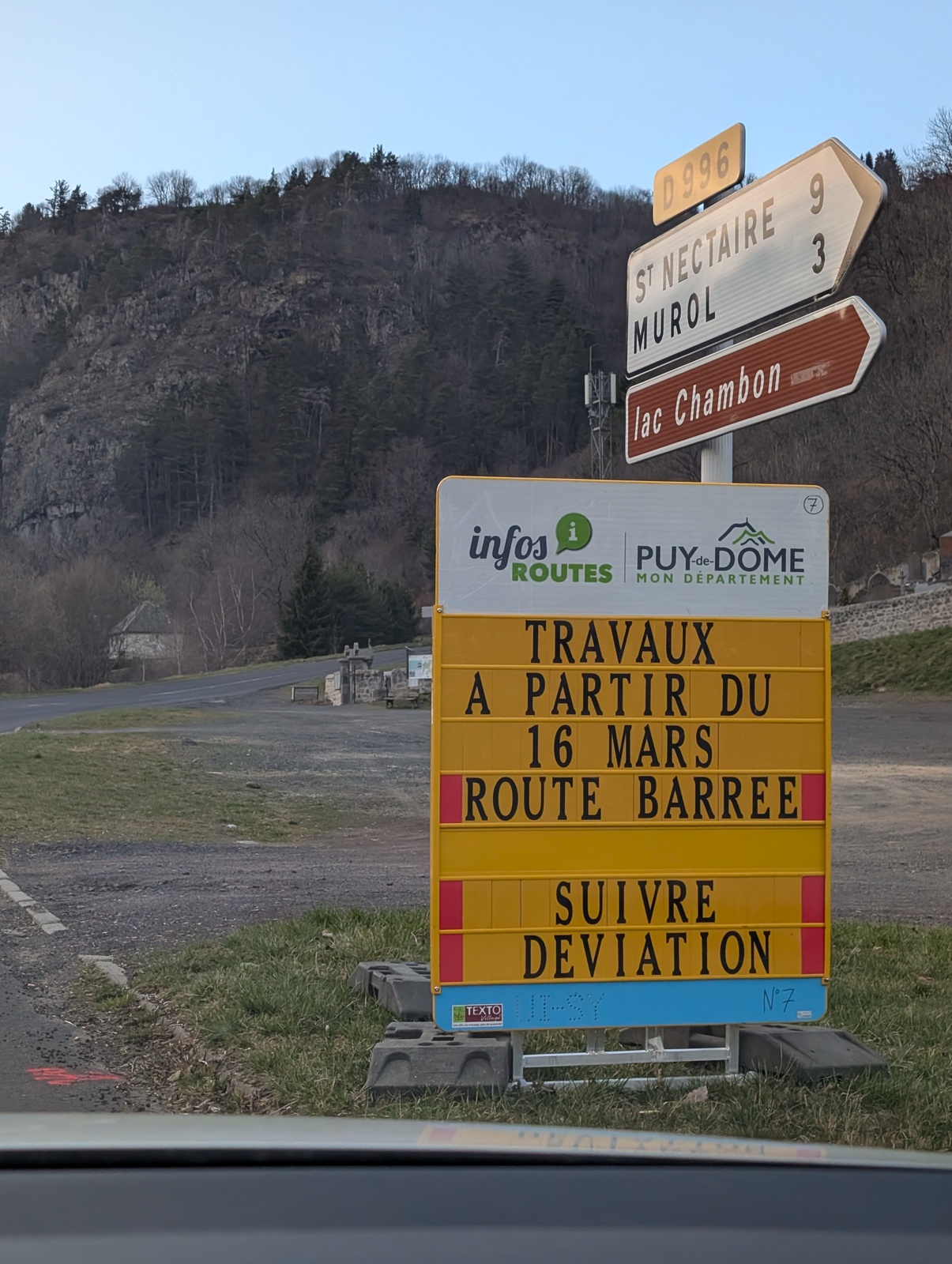 À partir du 16 mars 2026, des travaux de sécurisation de la route vont avoir lieu sur une portion de route de la commune de Chambon-sur-Lac, celle-ci sera fermée durant 4 mois. Les travaux sont organisés par le département du Puy-de-Dôme. Il y a des falaises et rochers en surplomb au-dessus de la route qui posent problème (a priori ce seront de gros travaux de sécurisation sur plusieurs périodes/plusieurs années).