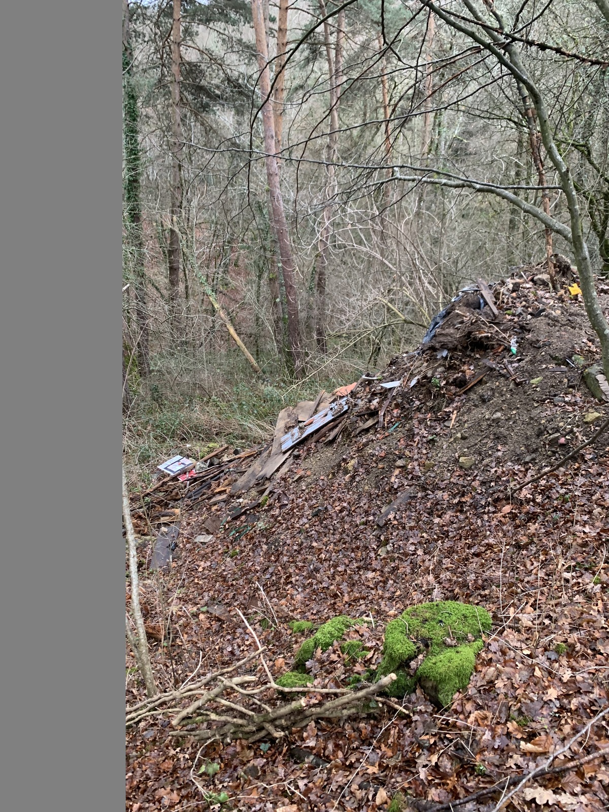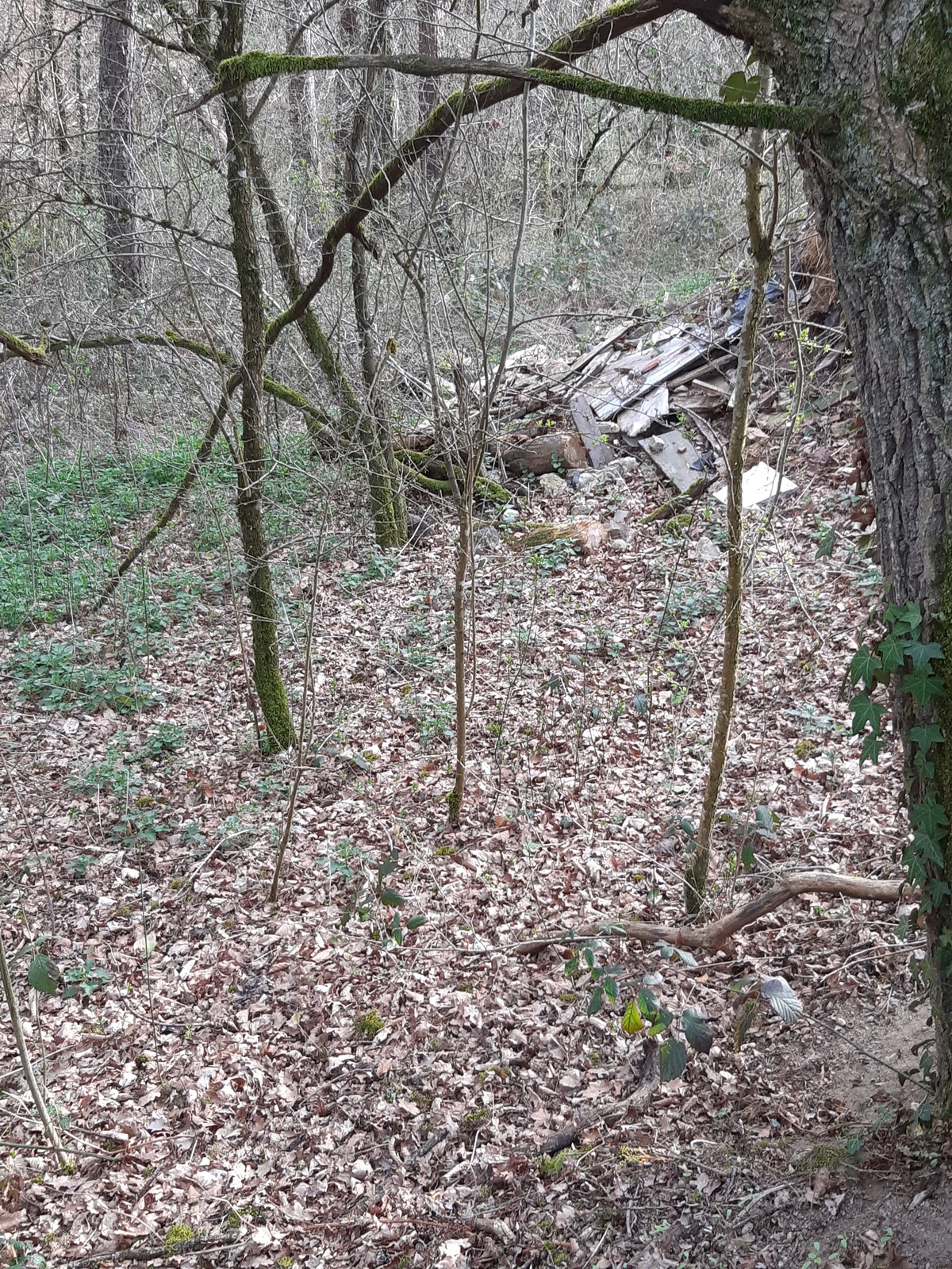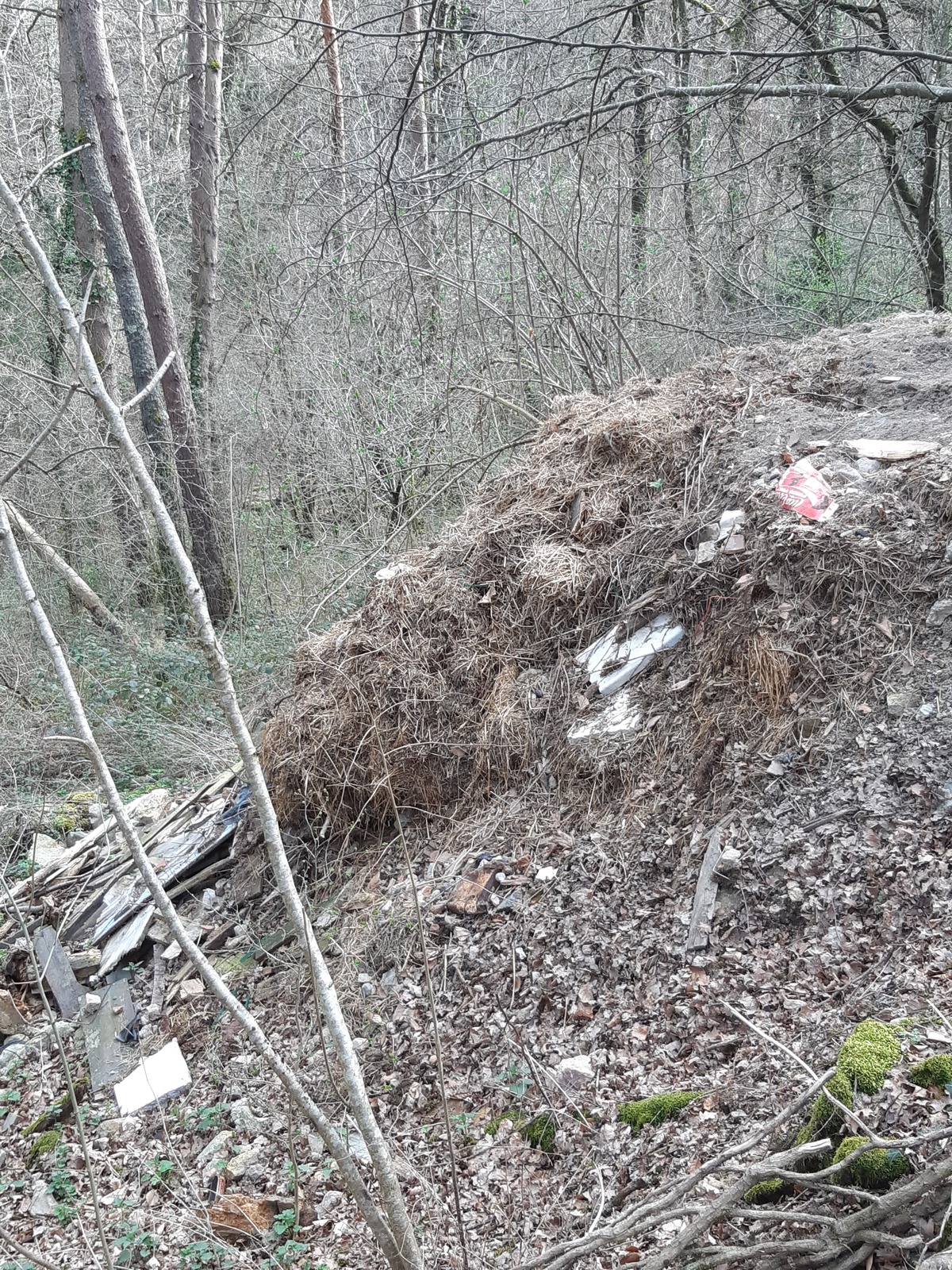 Dépôt sauvage de déchets divers en bord du chemin de randonnée peu à peu remblayé.