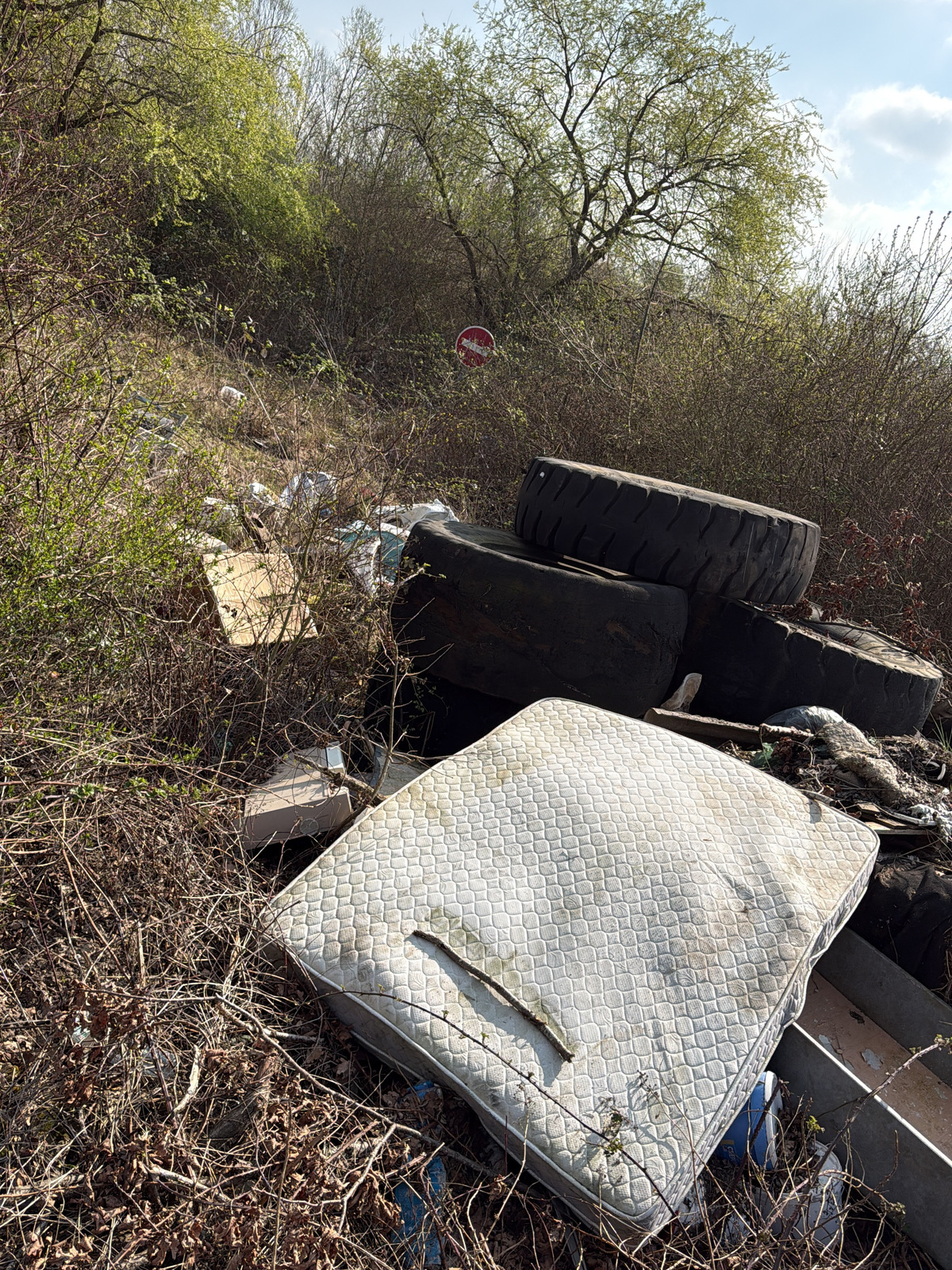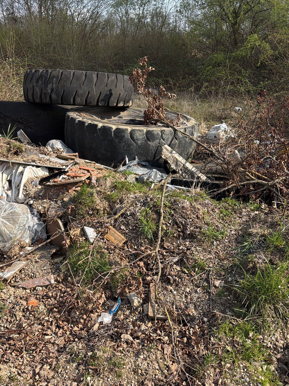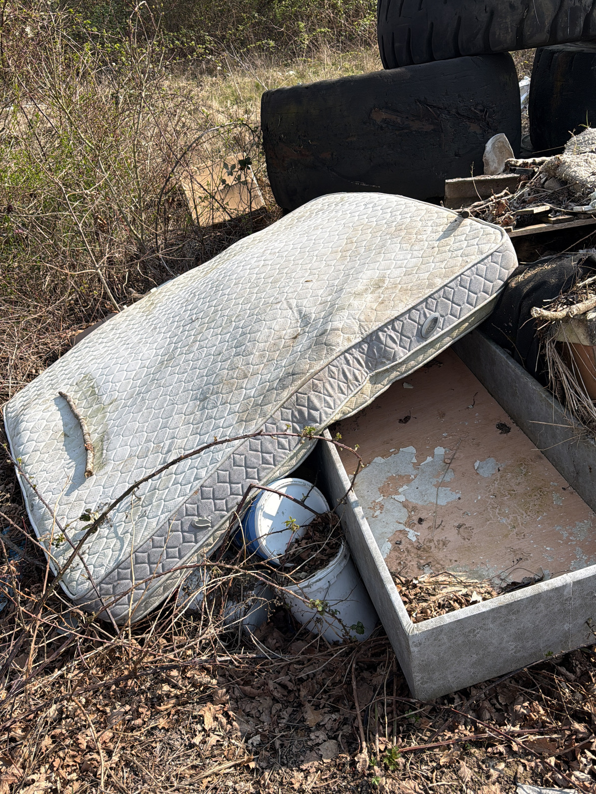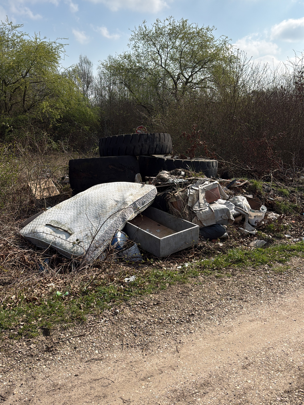 Présence d'environ 10 m³ de déchets, comprenant des matelas, des pneus de tracteurs et divers déchets ménagers.