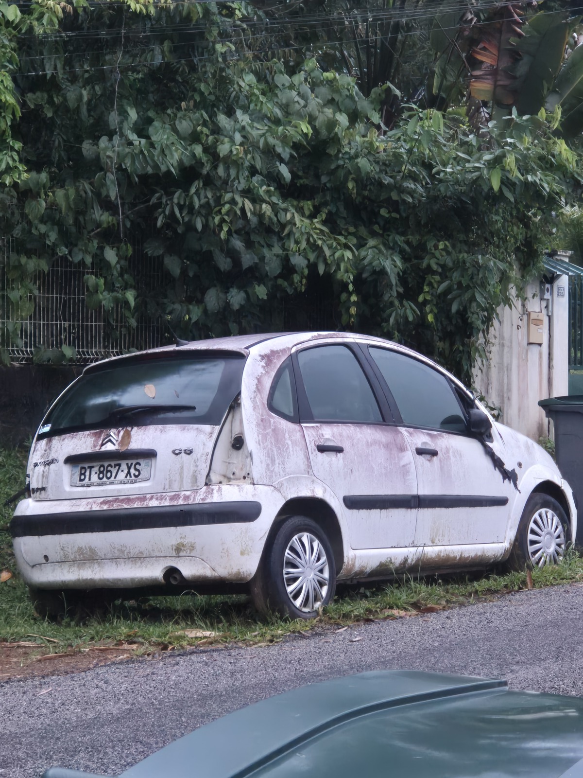 Une sentinelle a signalé une carcasse de véhicule Citroën c3 blanche présente depuis plusieurs années sur le bas côté de la route. Le véhicule est totalement a l'abandon, délabré et démembré.