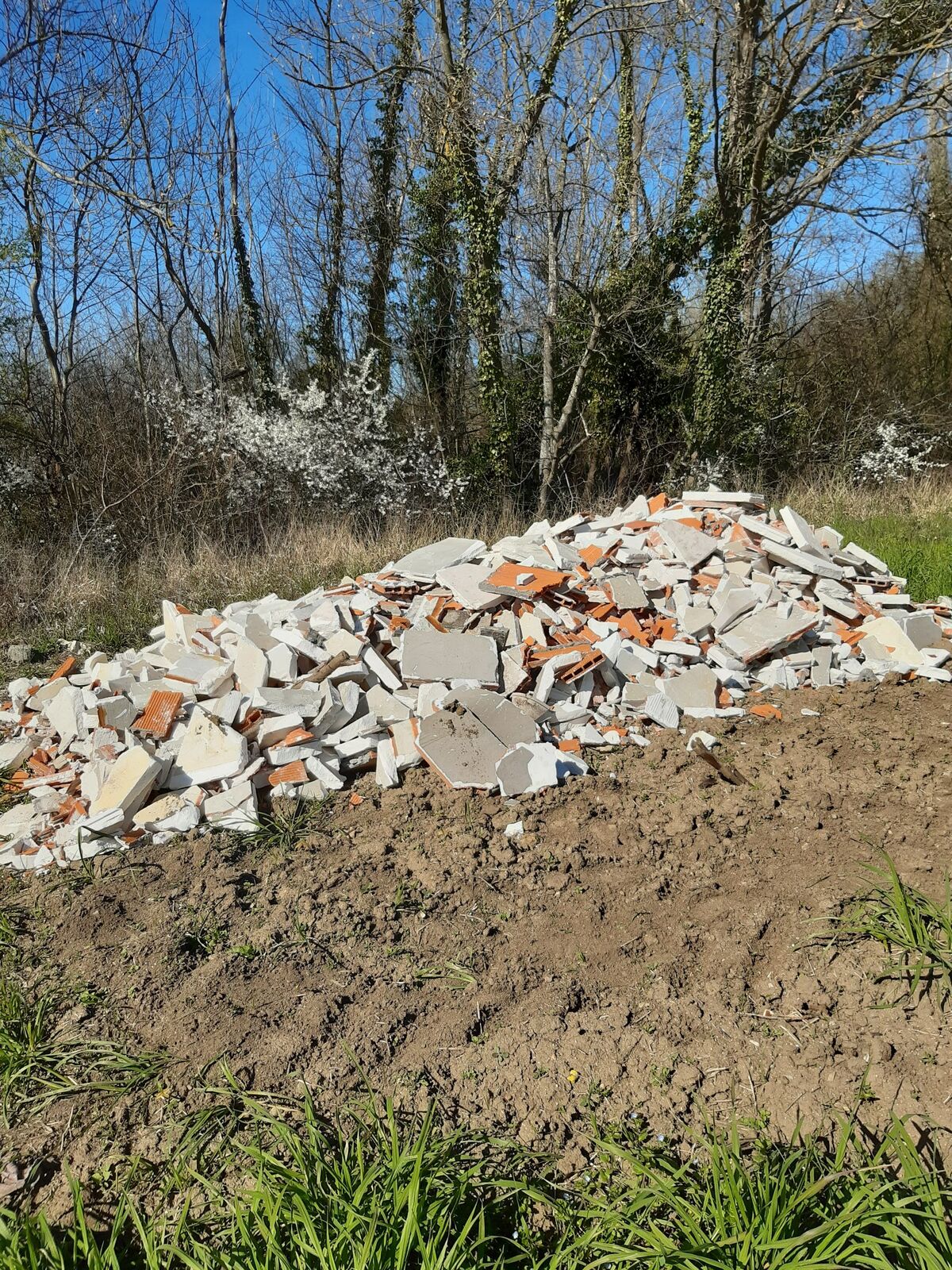 Divers déchets de construction déchargés au bord du chemin le long du Sardon