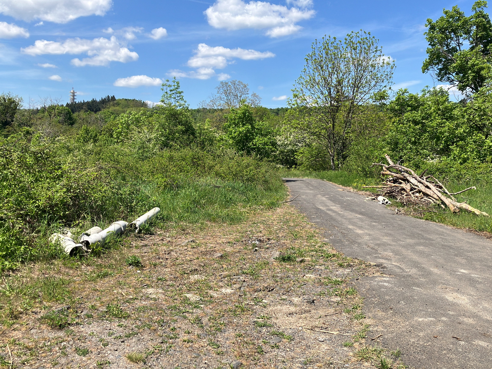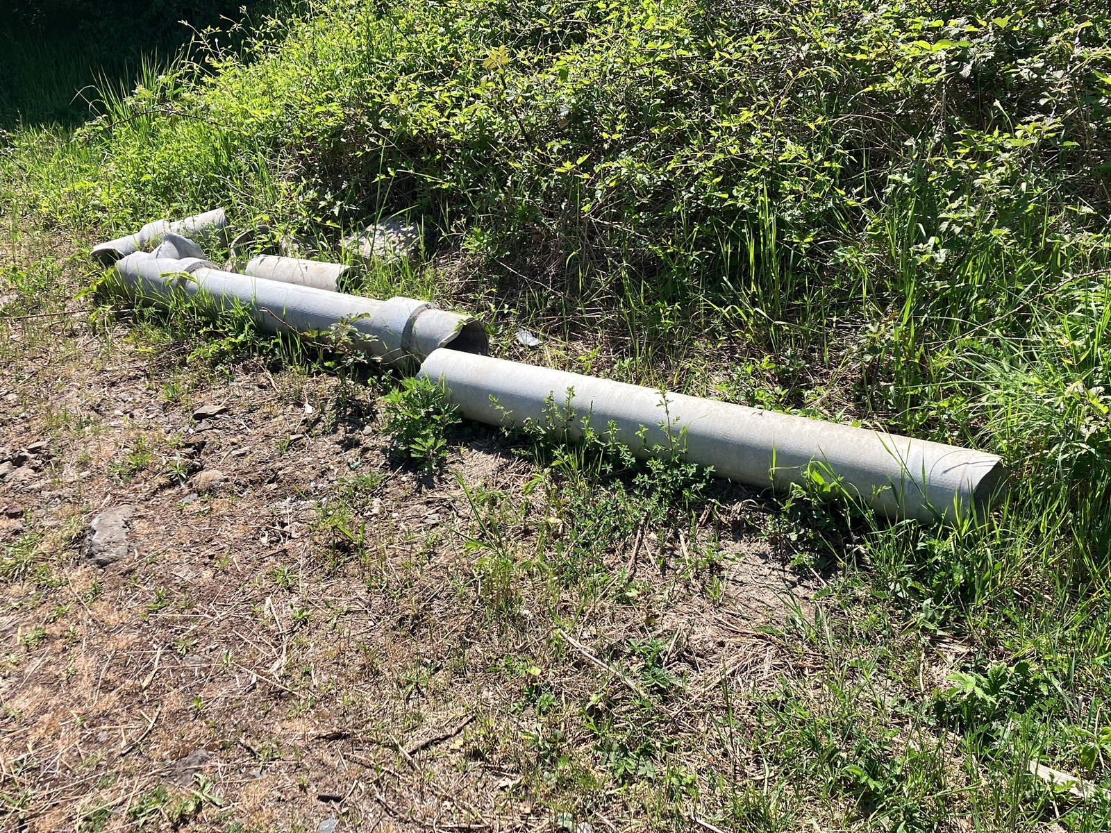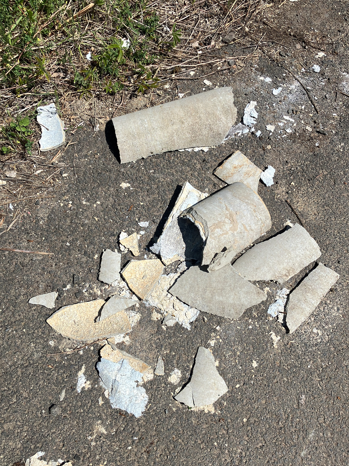 Déchets de construction en fibrociment déposés en bord de chemin carrossable.