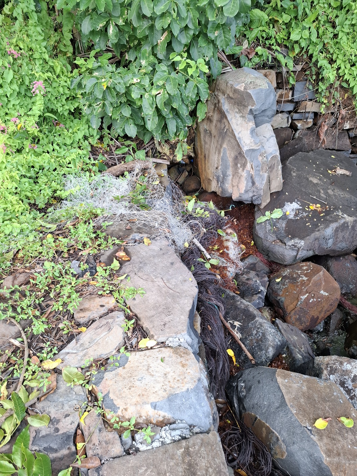 Des déchets de pêche (filets), des déchets plastiques et une zone de brûlage de déchets (avec restes de canettes et plastiques) ont été signalés sur l'Ilet La Mère. Des pêcheurs ont été observés jeter directement des morceaux de filets dans les enrochements autour de la jetée. Les filets peuvent finir en mer et piéger tortues, poissons et mammifères marins.