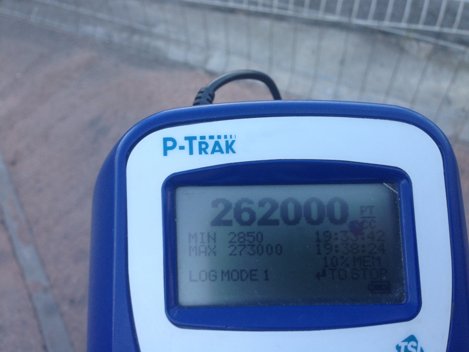 Mesures de particules ultra-fines (entre 0,3 et 0,1 microgrammes) le 18/07/19 qui ont révélées un air quasiment 100 fois plus chargé en particules ultrafines que dans la zone piétonne prise comme référence. À noter que la mesure réalisée à proximité du trafic routier montre un nombre de particules ultrafines 10 fois plus élevé que dans la zone piétonne.