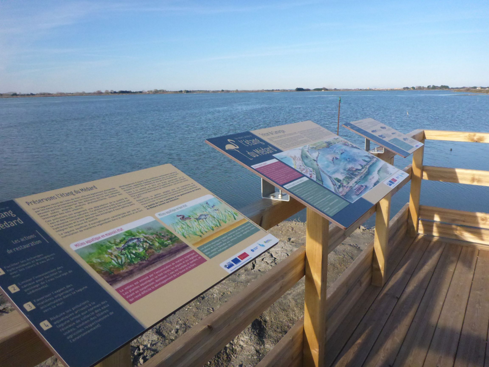 - La création d’une plateforme de découverte et de trois panneaux pédagogiques qui ont été installés le long de la ViaRhôna. Les cyclistes et passants peuvent dorénavant y découvrir l'histoire de l'étang, son fonctionnement et sa vie piscicole.