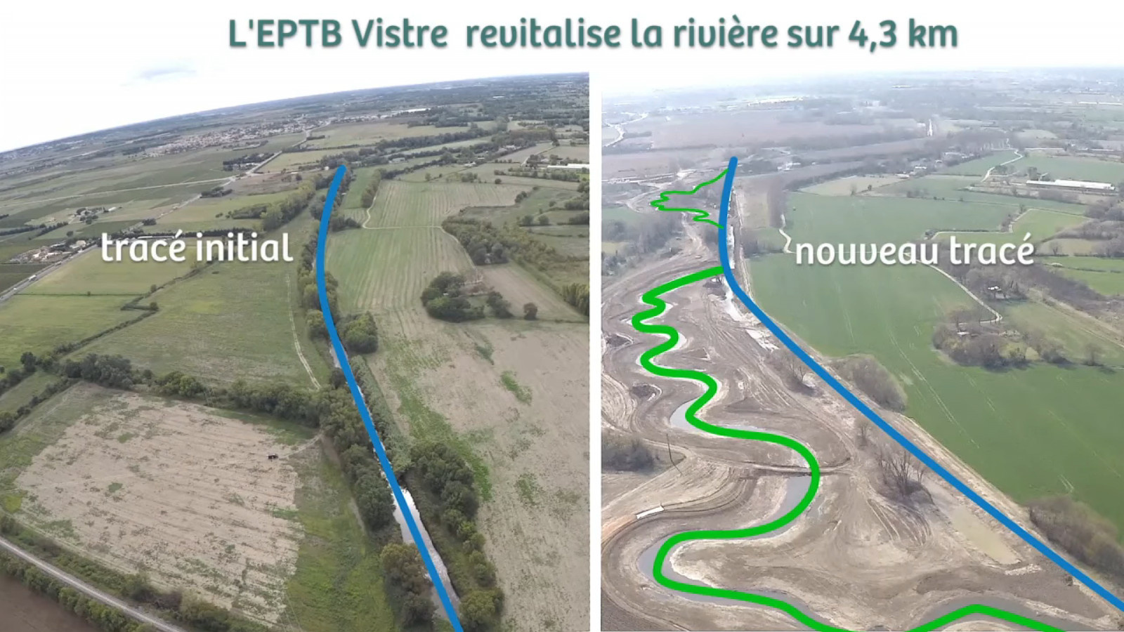 Travaux de re-méandrage du Vistre qui repasse d'un tracé rectiligne à une zone de méandres sur 4 300 mètres. Ralentissement des crues, zone plus favorable à la biodiversité.