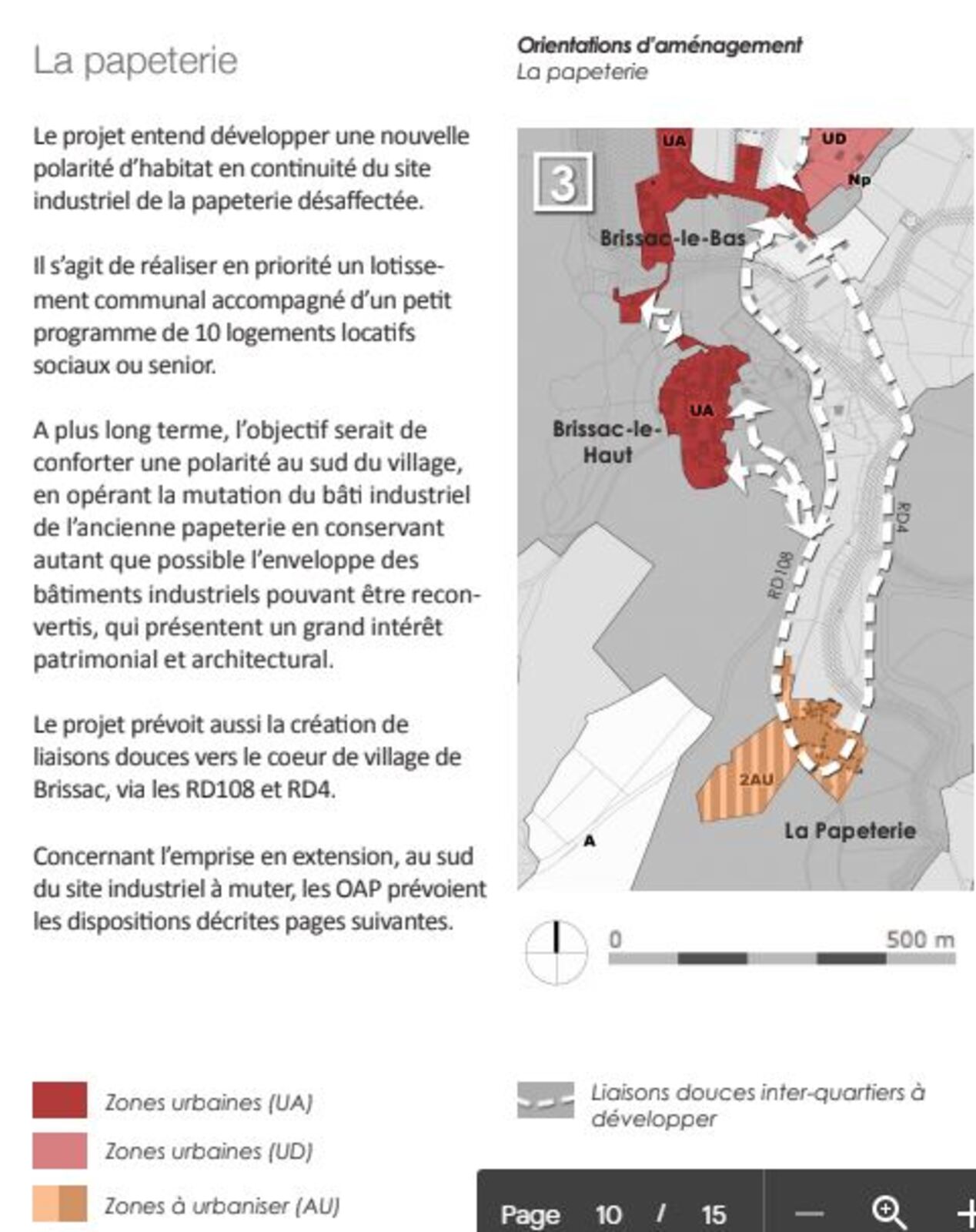Le projet de PLU prévoit d’inscrire les parcelles situées aux alentours immédiats de l’ancienne papeterie ainsi que les anciens bâtiments industriels, dans une zone à urbaniser (AU) de 1,2 hectares. Le site de la papeterie est susceptible d’accueillir à terme des activités, de l’habitat et/ou des équipements. La commune entend également programmer sur ce site une résidence senior. Les parcelles concernées par ce classement AU, actuellement non artificialisées, sont entièrement incluses dans le périmètre du site Natura 2000 FR9101388 « Gorges de l’Hérault ».