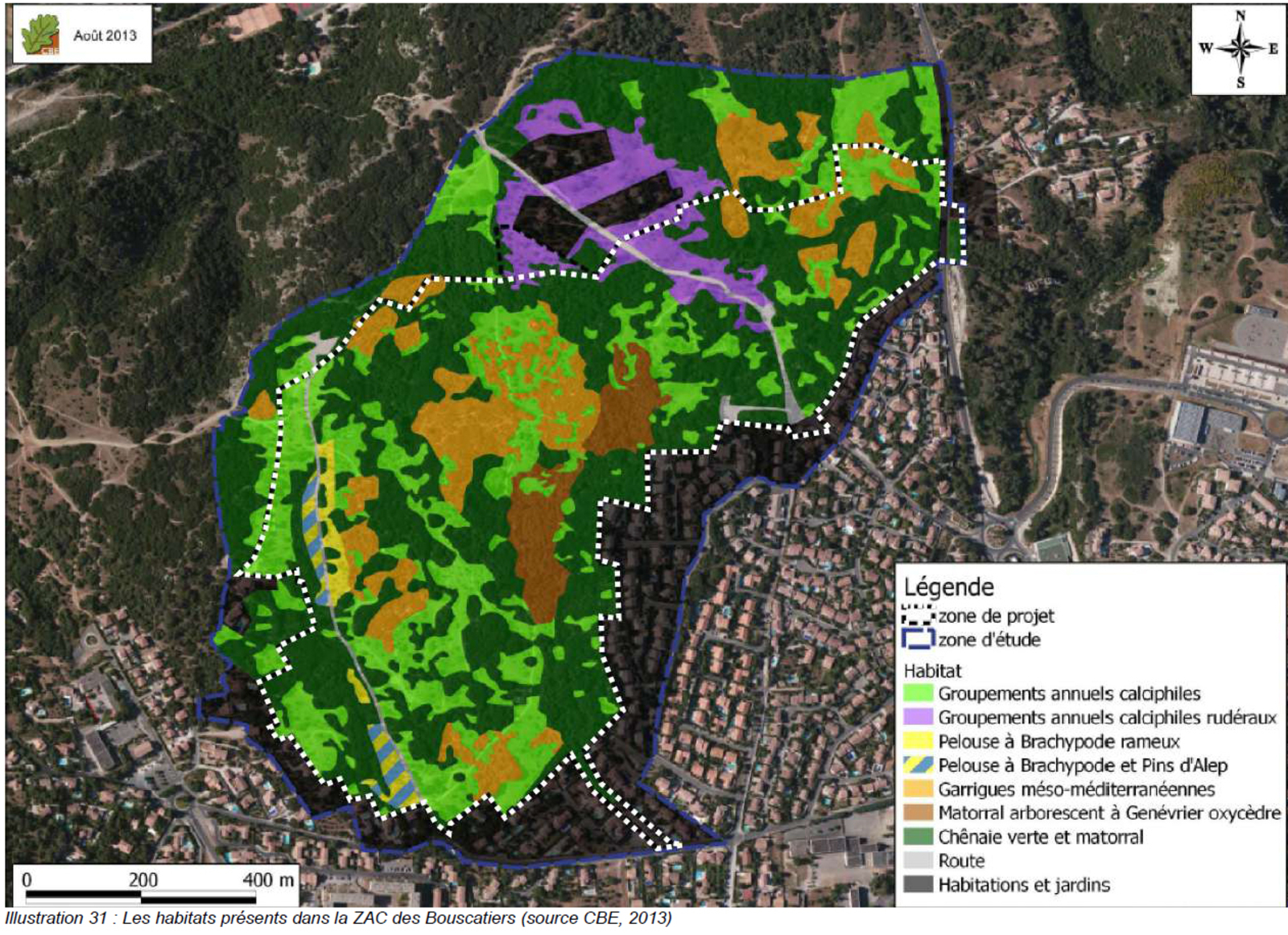 La commune de Villeneuve-lès-Avignon conduisait un projet d'urbanisme dit "ZAC des Bouscatiers" conduisant à la destruction de 36 ha d'espaces naturel, à la suppression du fonctionnement d'un corridor écologique en continuité avec une ZNIEFF, et à l'altération du fonctionnement écologique de 40 autres hectares de "compensation".