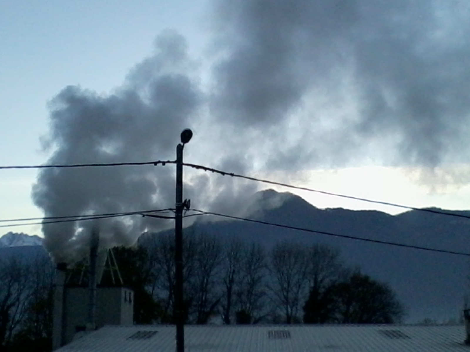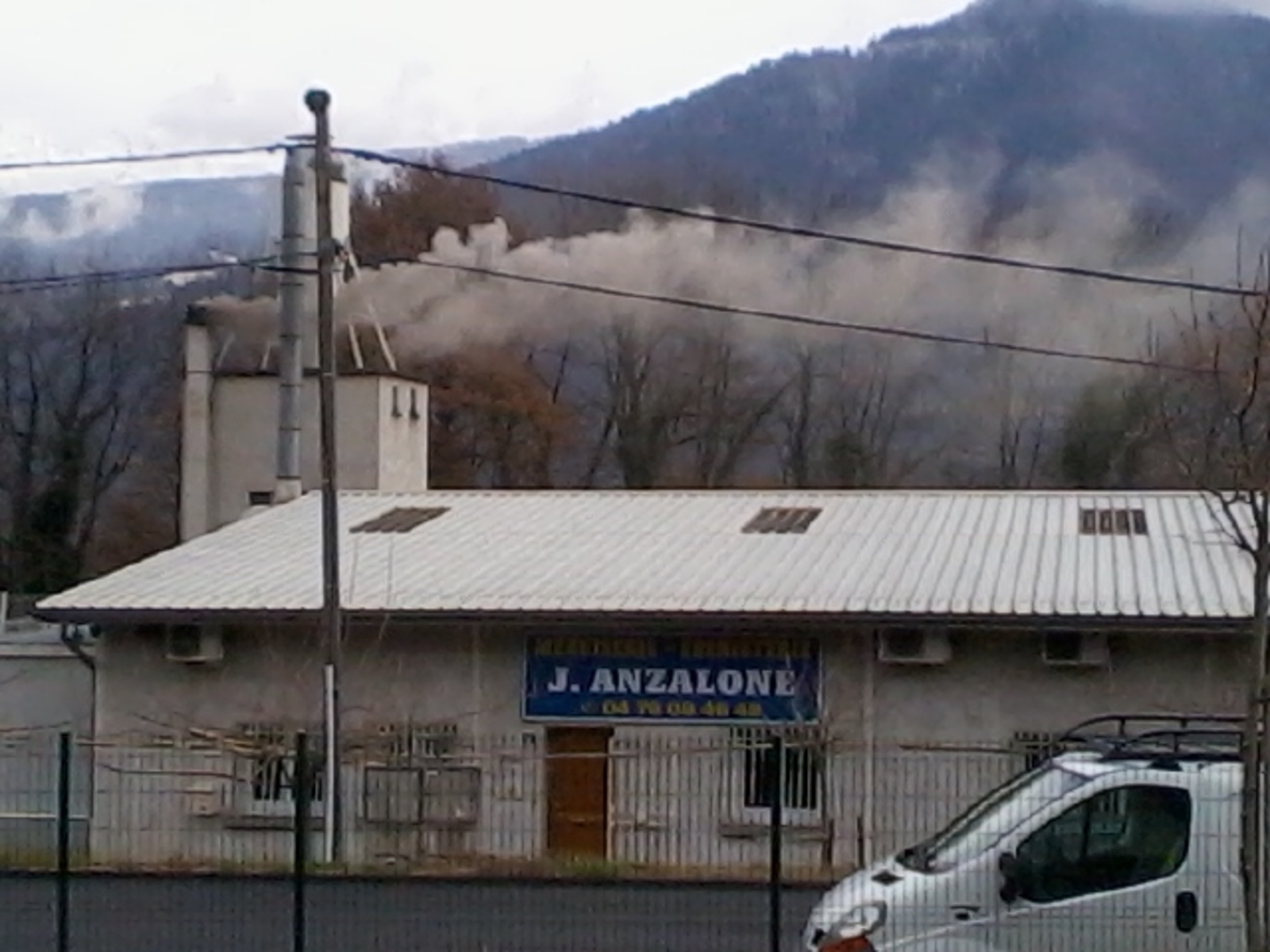 Rejets de fumée provenant de l’incinération des déchets d'une menuiserie. Cette fumée provient d'un conduit de fumée à proximité d'un silo de stockage de copeaux. La fumée est de couleurs grise/noir/bleu et parfois verte et de nature très dense.
