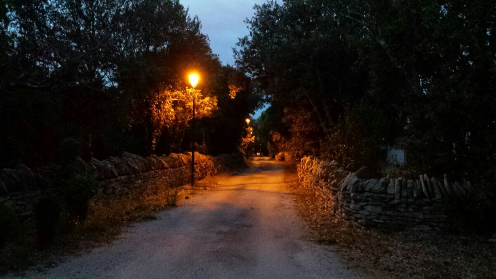 Rue éclairée toute la nuit en rase campagne.